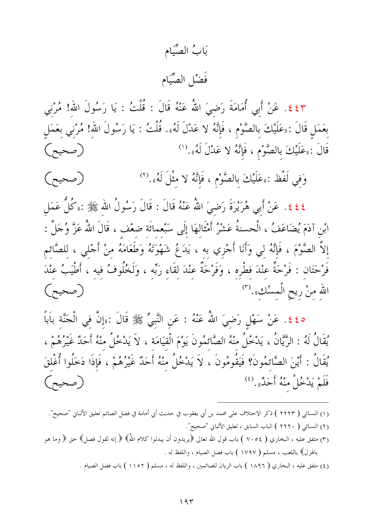 445 - عَنْ سَهْلٍ رَضِيَ اللهُ عَنْهُ: عَنِ النَّبِيِّ - صلى الله عليه وسلم - قَالَ: «إِنَّ فِي الْجَنَّةِ باَباً يُقَالُ لَهُ: الرَّيَّانُ، يَدْخُلُ مِنْهُ الصَّائِمُونَ يَوْمَ الْقِيَامَةِ، لاَ يَدْخُلُ مِنْهُ أَحَدٌ غَيْرُهُمْ، يُقَالُ: أَيْنَ الصَّائِمُونَ؟ فَيَقُومُونَ، لاَ يَدْخُلُ مِنْهُ أَحَدٌ غَيْرُهُمْ، فَإِذَا دَخَلُوا أُغْلِقَ فَلَمْ يَدْخُلْ مِنْهُ أَحَدٌ». (¬4) =صحيح