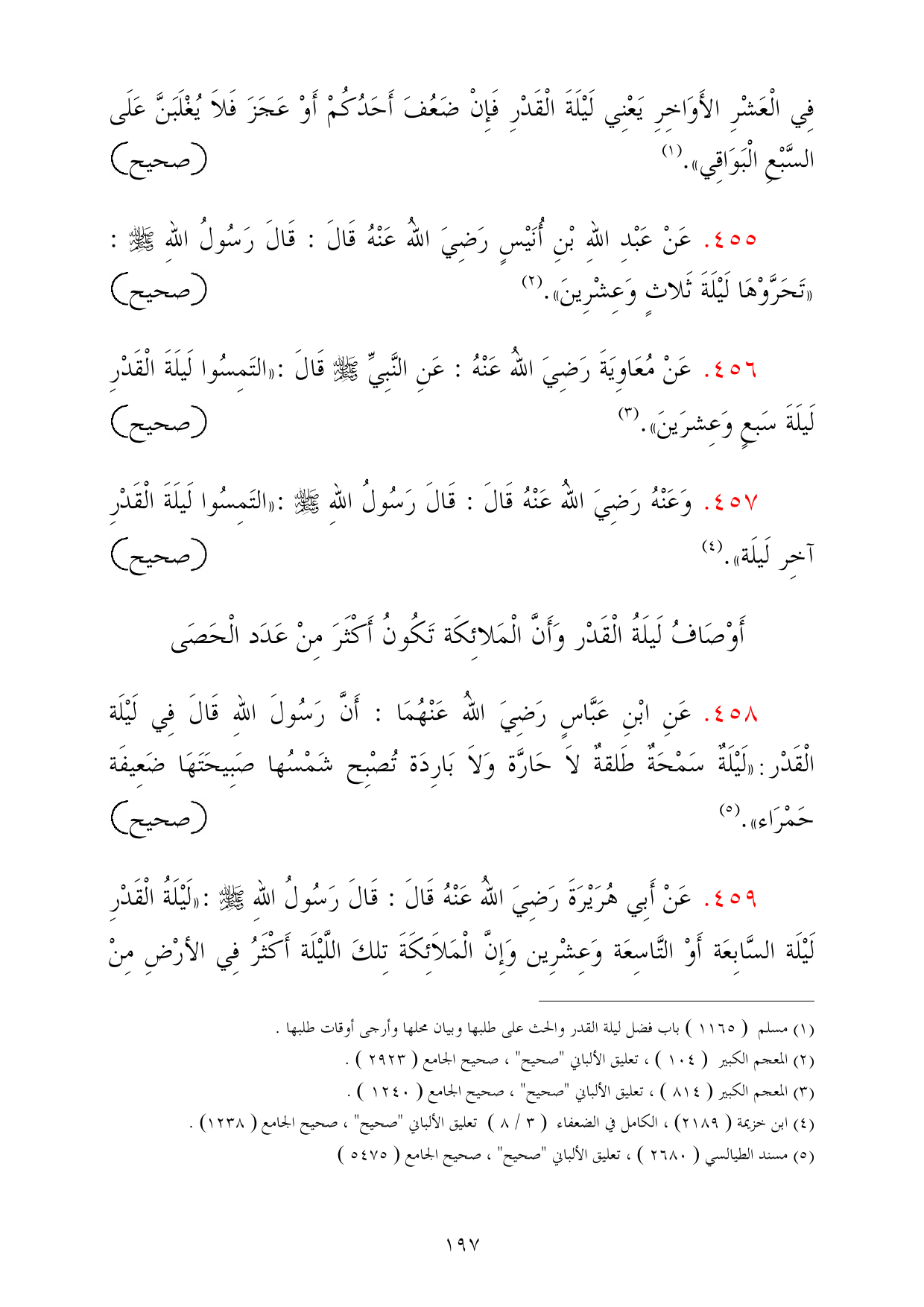 459 - عَنْ أَبِي هُرَيْرَةَ رَضِيَ اللهُ عَنْهُ قَالَ: قَالَ رَسُولُ اللهِ - صلى الله عليه وسلم -: «لَيْلَةُ الْقَدْرِ لَيْلَة السَّابِعَة أَوْ التَّاسِعَة وَعِشْرِين وَإِنَّ الْمَلاَئِكَةَ تِلكَ اللَّيْلَة أَكْثَرُ فِي الأرْضِ مِنْ