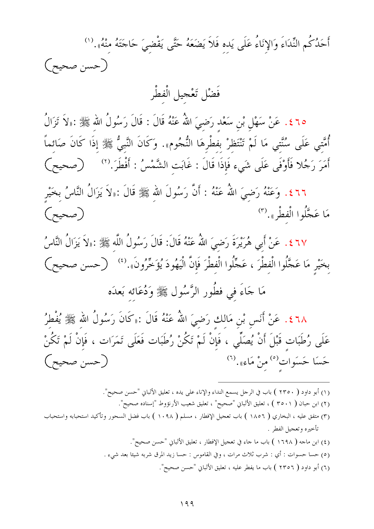 467 - عَنْ أَبِي هُرَيْرَةَ رَضِيَ اللهُ عَنْهُ قَالَ: قَالَ رَسُولُ اللَّهِ - صلى الله عليه وسلم -: «لاَ يَزَالُ النَّاسُ بِخَيْرٍ مَا عَجَّلُوا الْفِطْرَ، عَجِّلُوا الْفِطْرَ فَإِنَّ الْيَهُودَ يُؤَخِّرُونَ». (¬4) =حسن صحيح