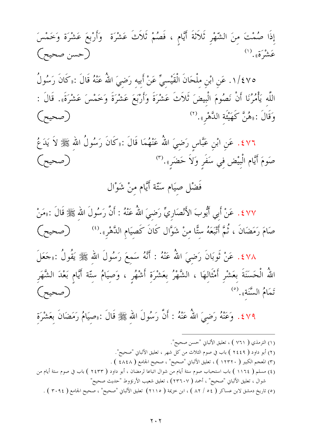 476 - عَنِ ابْنِ عَبَّاسٍ رَضِيَ اللهُ عَنْهُمَا قَالَ: «كَانَ رَسُولُ اللهِ - صلى الله عليه وسلم - لاَ يَدَعُ صَومَ أَيَّام الْبِيْض فِي سَفَرٍ وَلاَ حَضَرٍ». (¬3) =صحيح
