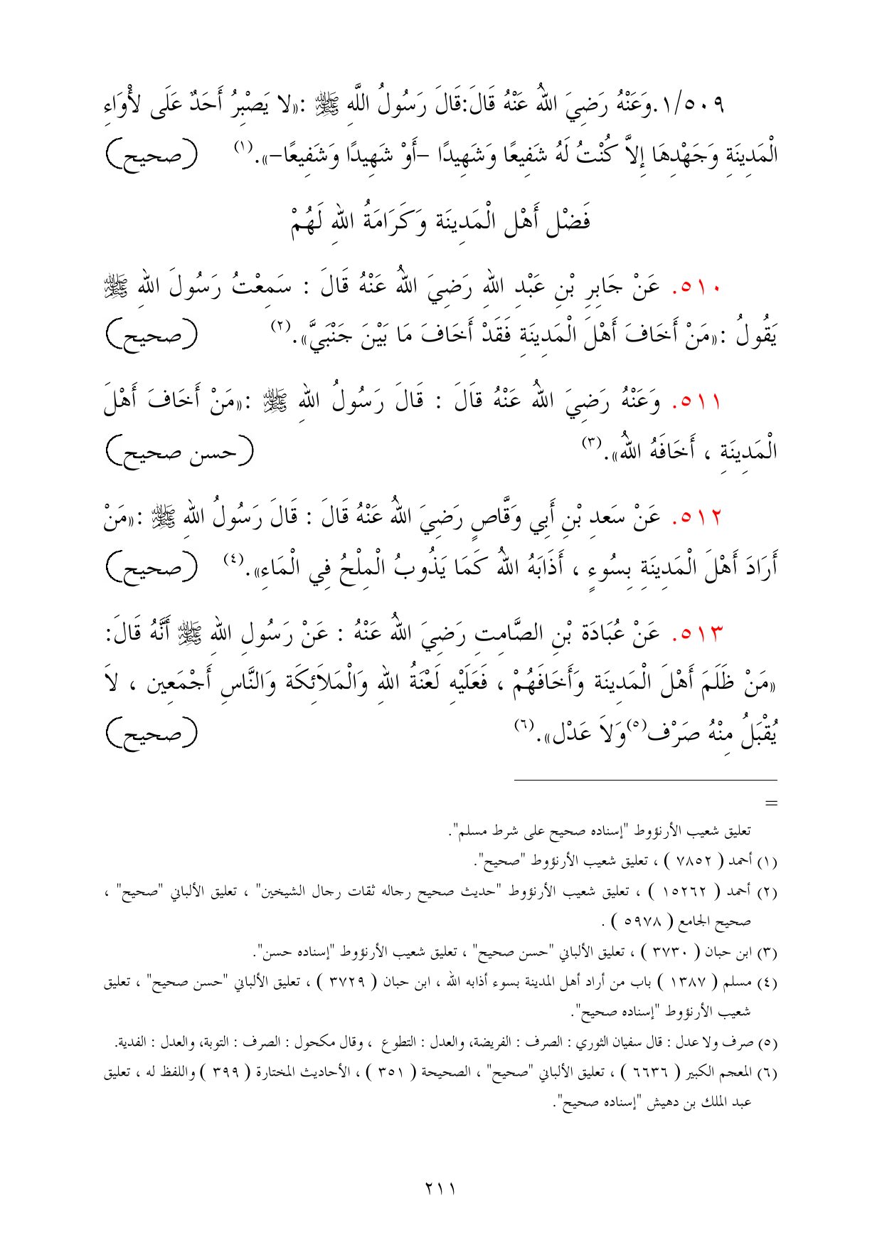 513 - عَنْ عُبَادَة بْنِ الصَّامِتِ رَضِيَ اللهُ عَنْهُ: عَنْ رَسُولِ اللهِ - صلى الله عليه وسلم - أَنَّهُ قَالَ: «مَنْ ظَلَمَ أَهْلَ الْمَدِينَة وَأَخَافَهُمْ، فَعَلَيْهِ لَعْنَةُ اللهِ وَالْمَلاَئِكَة وَالنَّاسِ أَجْمَعِين، لاَ يُقْبَلُ مِنْهُ صَرْف (¬5) وَلاَ عَدْل». (¬6) =صحيح