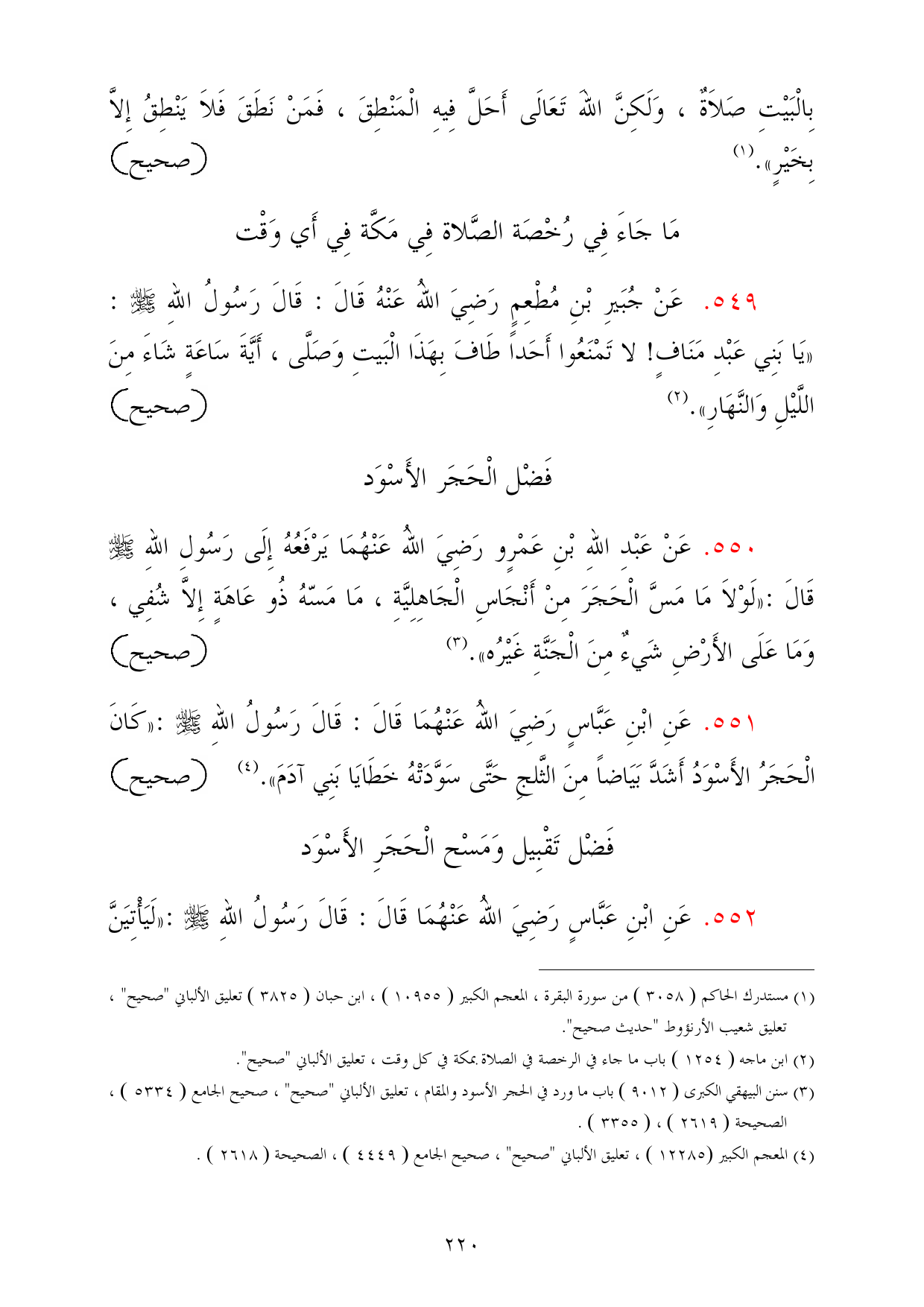 551 - عَنِ ابْنِ عَبَّاسٍ رَضِيَ اللهُ عَنْهُمَا قَالَ: قَالَ رَسُولُ اللهِ - صلى الله عليه وسلم -: «كَانَ الْحَجَرُ الأَسْوَدُ أَشَدَّ بَيَاضاً مِنَ الثَّلجِ حَتَّى سَوَّدَتْهُ خَطَايَا بَنِي آدَمَ». (¬4) =صحيح