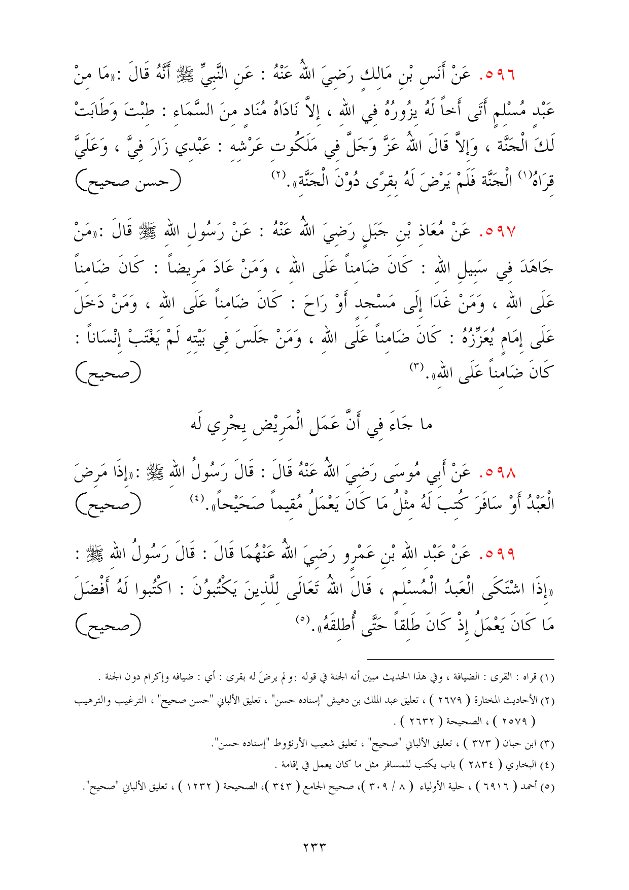 599 - عَنْ عَبْدِ اللهِ بْنِ عَمْرٍو رَضِيَ اللهُ عَنْهُمَا قَالَ: قَالَ رَسُولُ اللهِ - صلى الله عليه وسلم -: «إِذَا اشْتَكَى الْعَبدُ الْمُسْلِم، قَالَ اللهُ تَعَالَى لِلَّذِينَ يَكْتُبوُنَ: اكْتُبوا لَهُ أَفْضَلَ مَا كَانَ يَعْمَلُ إِذْ كَانَ طَلِقاً حَتَّى أُطلِقَهُ». (¬5) =صحيح