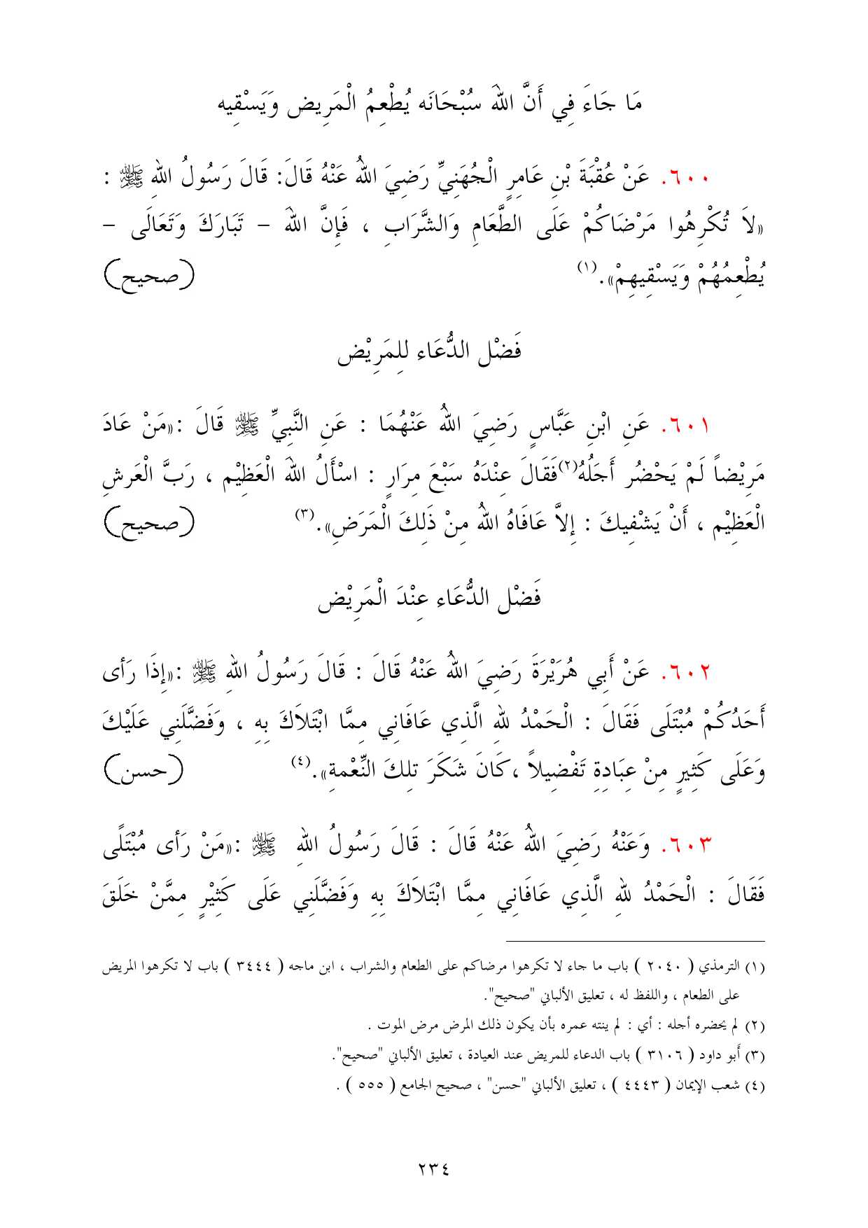 603 - وَعَنْهُ رَضِيَ اللهُ عَنْهُ قَالَ: قَالَ رَسُولُ اللهِ - صلى الله عليه وسلم -: «مَنْ رَأى مُبْتَلًى فَقَالَ: الْحَمْدُ للهِ الَّذِي عَافَانِي مِمَّا ابْتَلاَكَ بِهِ وَفَضَّلَنِي عَلَى كَثِيْرٍ مِمَّنْ خَلَقَ