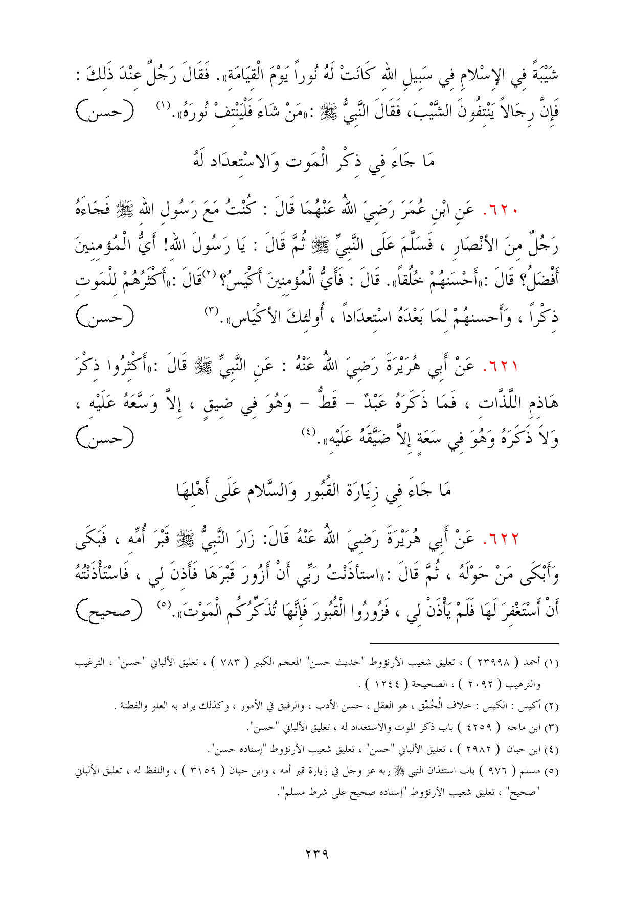622 - عَنْ أَبِي هُرَيْرَةَ رَضِيَ اللهُ عَنْهُ قَالَ: زَارَ النَّبِيُّ - صلى الله عليه وسلم - قَبْرَ أُمِّهِ، فَبَكَى وَأَبْكَى مَنْ حَوْلَهُ، ثُمَّ قَالَ: «استأذَنْتُ رَبِّي أَنْ أَزُورَ قَبْرَهَا فَأَذِنَ لِي، فَاسْتَأْذَنْتُهُ أَنْ أَسْتَغْفِرَ لَهَا فَلَمْ يَأْذَنْ لِي، فَزُورُوا الْقُبُورَ فَإِنَّهَا تُذَكِّرُكُم الْمَوْتَ». (¬5) =صحيح