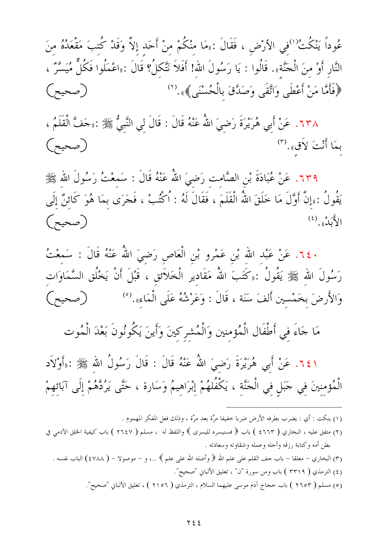 641 - عَنْ أَبِي هُرَيْرَةَ رَضِيَ اللهُ عَنْهُ قَالَ: قَالَ رَسُولُ اللهِ - صلى الله عليه وسلم -: «أَوْلاَد الْمُؤمِنِينَ فِي جَبَلٍ فِي الْجَنَّةِ، يَكْفُلهُمْ إِبْرَاهِيمُ وَسَارة، حَتَّى يَرُدَّهُمْ إِلَى آبَائِهِمْ