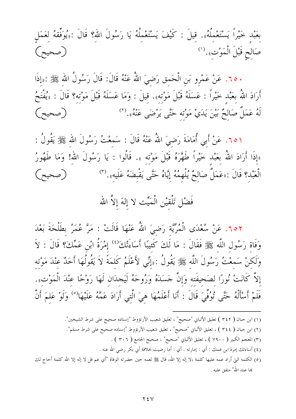 651 - عَنْ أَبِي أُمَامَةَ رَضِيَ اللهُ عَنْهُ قَالَ: سَمِعْتُ رَسُولَ اللهِ - صلى الله عليه وسلم - يَقُولُ: «إِذَا أَرَادَ اللهُ بِعَبْدٍ خَيْراً طَهَّرَهُ قَبْلَ مَوْتِهِ». قَالُوا: يَا رَسُولَ اللهِ! وَمَا طَهُورُ الْعَبْدِ؟ قَالَ: «عَمَلٌ صَالِحٌ يُلْهِمُهُ إِيَّاهُ حَتَّى يَقْبِضَهُ عَلَيهِ». (¬3) =صحيح