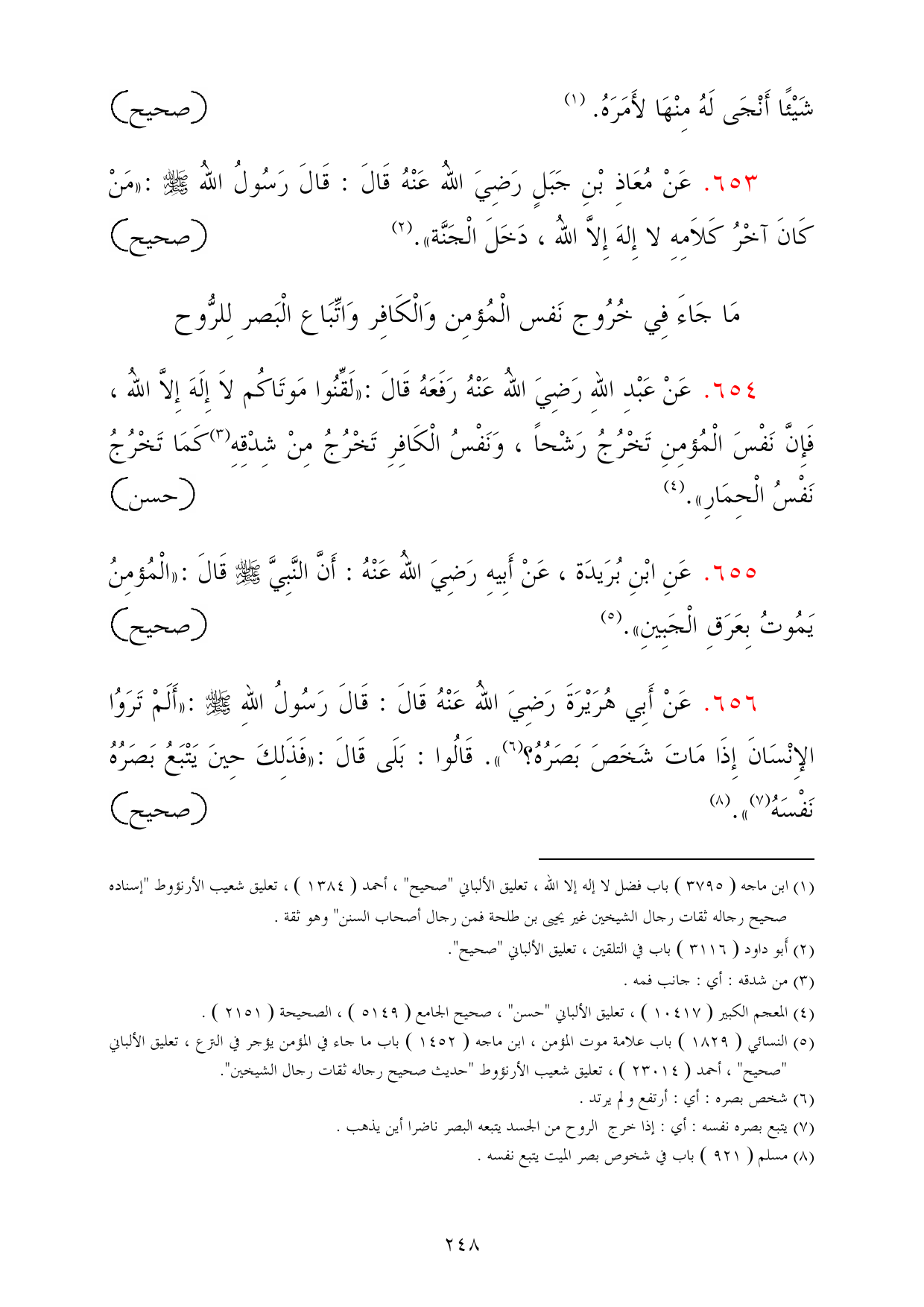 655 - عَنِ ابْنِ بُرَيدَة، عَنْ أَبِيهِ رَضِيَ اللهُ عَنْهُ: أَنَّ النَّبِيَّ - صلى الله عليه وسلم - قَالَ: «الْمُؤمِنُ يَمُوتُ بِعَرَقِ الْجَبِينِ». (¬5) =صحيح