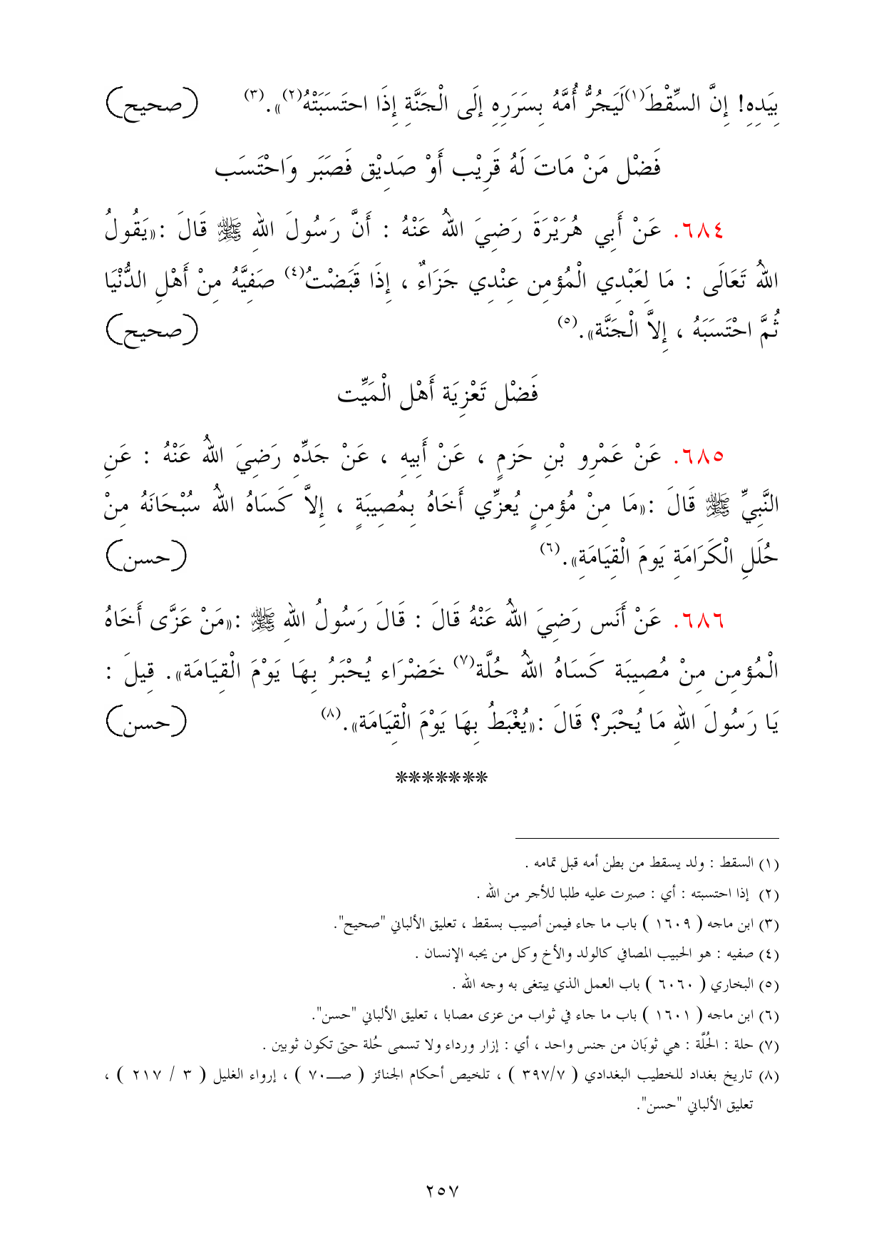 (¬8) تاريخ بغداد للخطيب البغدادي (7/ 397)، تلخيص أحكام الجنائز (صـ70)، إرواء الغليل (3/ 217)، تعليق الألباني "حسن".