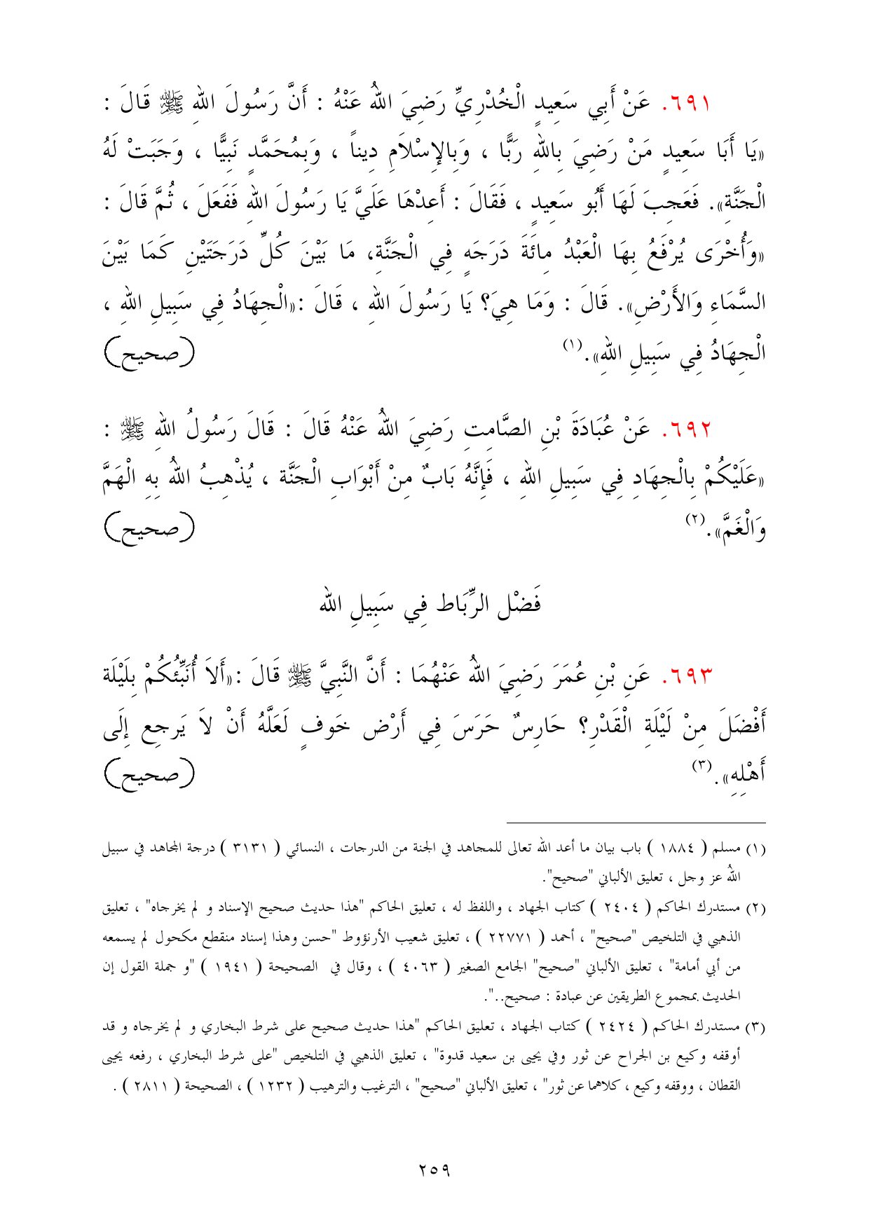(¬2) مستدرك الحاكم (2404) كتاب الجهاد، واللفظ له، تعليق الحاكم "هذا حديث صحيح الإسناد ولم يخرجاه"، تعليق الذهبي في التلخيص "صحيح"، أحمد (22771)، تعليق شعيب الأرنؤوط "حسن وهذا إسناد منقطع مكحول لم يسمعه من أبي أمامة"، تعليق الألباني "صحيح" الجامع الصغير (4063)، وقال في الصحيحة (1941 ("وجملة القول إن الحديث بمجموع الطريقين عن عبادة: صحيح .. ".
