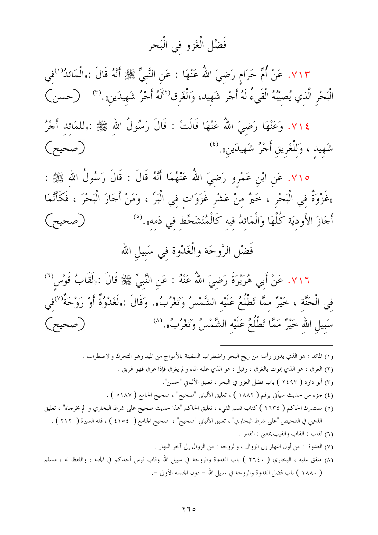 716 - عَنْ أَبِي هُرَيْرَةَ رَضِيَ اللهُ عَنْهُ: عَنِ النَّبِيِّ - صلى الله عليه وسلم - قَالَ: «لَقَابُ قَوْسٍ (¬6) فِي الْجَنَّةِ، خَيْرٌ مِمَّا تَطْلُعُ عَلَيْهِ الشَّمْسُ وَتَغْرُبُ». وَقَالَ: «لَغَدْوُةٌ أَوْ رَوْحَةٌ (¬7) فِي سَبِيلِ اللهِ خَيْرٌ مَمَّا تَطْلُعُ عَلَيْهِ الشَّمْسُ وَتَغْرُبُ». (¬8) =صحيح