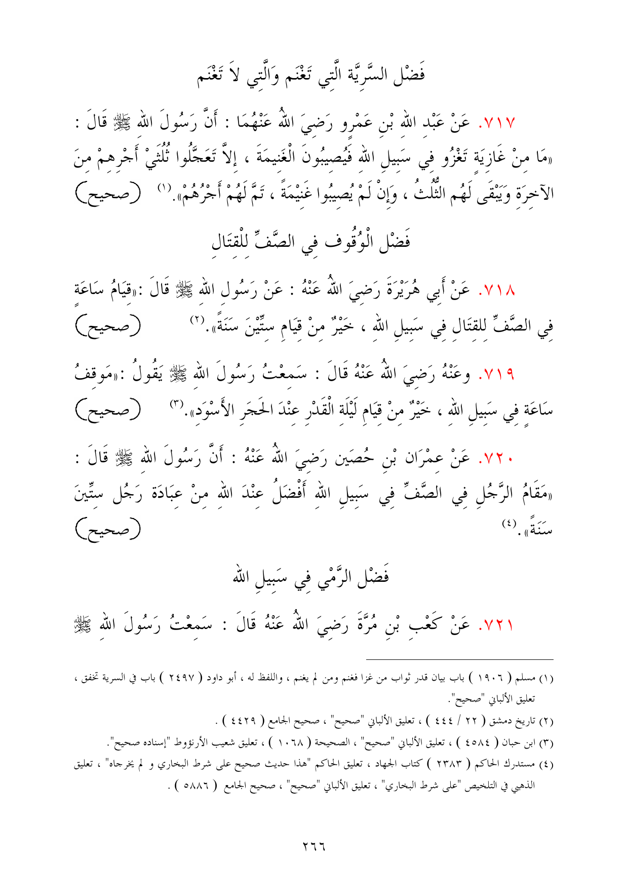 718 - عَنْ أَبِي هُرَيْرَةَ رَضِيَ اللهُ عَنْهُ: عَنْ رَسُولِ اللهِ - صلى الله عليه وسلم - قَالَ: «قِيَامُ سَاعَةٍ فِي الصَّفِّ لِلقِتَالِ فِي سَبِيلِ اللهِ، خَيْرٌ مِنْ قِيَامِ سِتِّيْنَ سَنَةً». (¬2) =صحيح