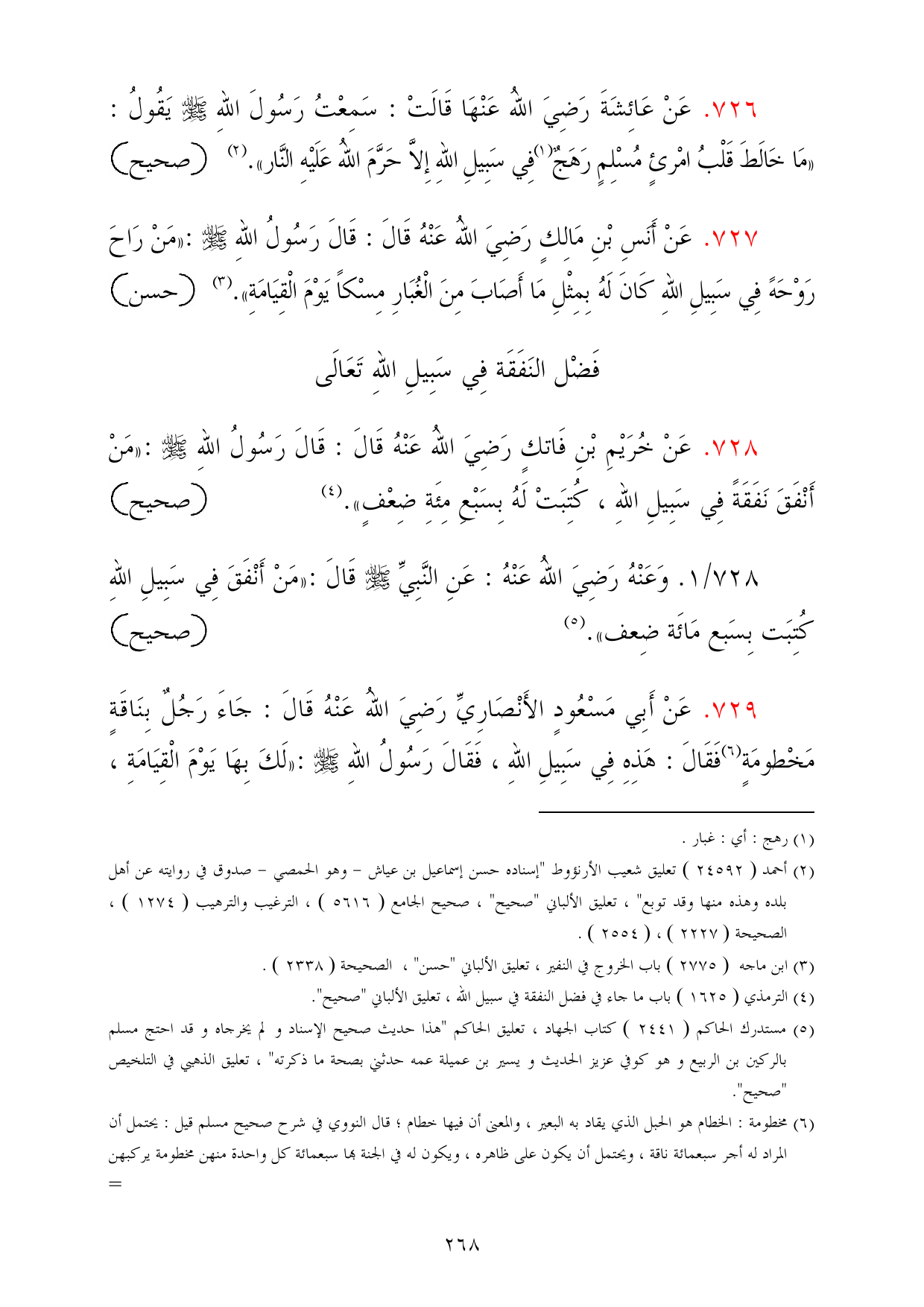 728/ 1. وَعَنْهُ رَضِيَ اللهُ عَنْهُ: عَنِ النَّبِيِّ - صلى الله عليه وسلم - قَالَ: «مَنْ أَنْفَقَ فِي سَبِيلِ اللهِ كُتِبَت بِسَبع مَائَة ضِعف». (¬5) =صحيح