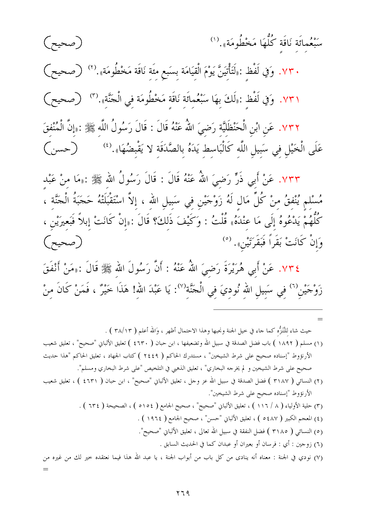 (¬1) مسلم (1892) باب فضل الصدقة في سبيل الله وتضعيفها، ابن حبان (4630) تعليق الألباني "صحيح"، تعليق شعيب الأرنؤوط "إسناده صحيح على شرط الشيخين"، مستدرك الحاكم (2449) كتاب الجهاد، تعليق الحاكم "هذا حديث صحيح على شرط الشيخين ولم يخرجه البخاري"، تعليق الذهبي في التلخيص "على شرط البخاري ومسلم".