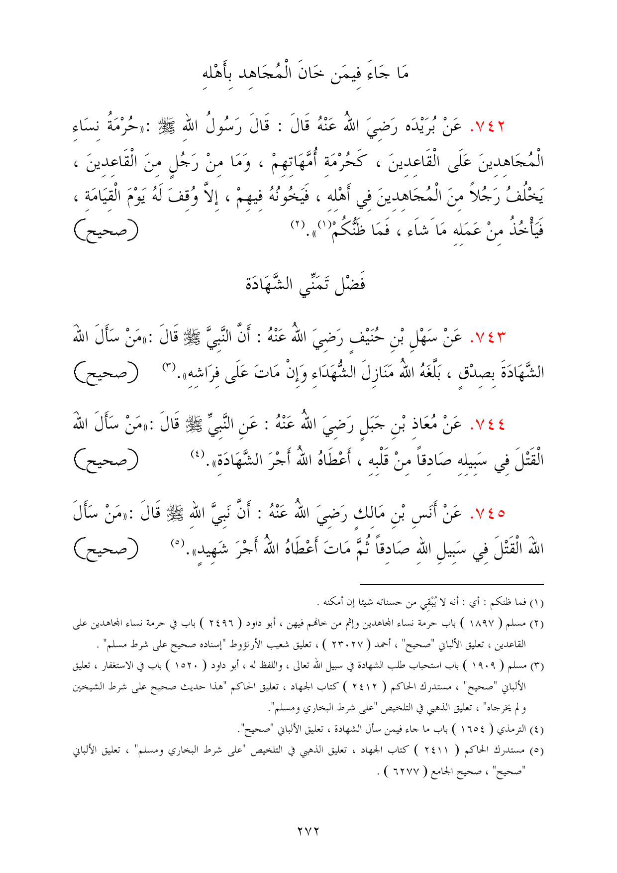 744 - عَنْ مُعَاذِ بْنِ جَبَلٍ رَضِيَ اللهُ عَنْهُ: عَنِ النَّبِيِّ - صلى الله عليه وسلم - قَالَ: «مَنْ سَأَلَ اللهَ الْقَتْلَ فِي سَبِيلِهِ صَادِقاً مِنْ قَلْبِهِ، أَعْطَاهُ اللهُ أَجْرَ الشَّهَادَةِ». (¬4) =صحيح