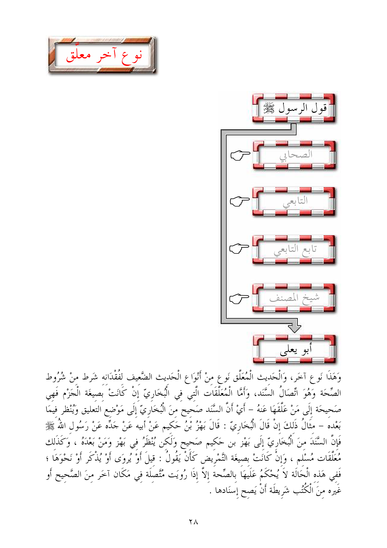 وَهَذَا نَوع آخَر، وَالْحَدِيث الْمُعَلَّق نَوع مِنْ أَنْوَاع الْحَدِيث الضَّعِيف لِفُقْدَانِهِ شَرط مِنْ شُرُوط الصِّحَة وَهُوَ اتِّصَالُ السَّنَد، وَأَمَّا الْمُعَلَّقَات الَّتِي فِي الْبُخَارِيّ إِنْ كَانَتْ بِصِيغَة الْجَزْم فَهِي صَحِيحَة إِلَى مَنْ عَلَّقَهَا عَنهُ - أَيْ أَنَّ السَّنَد صَحِيح مِنَ الْبُخَارِيّ إِلَى مَوْضِع التعليق وَيُنْظر فِيمَا بَعْده - مِثَالُ ذَلِكَ إِنْ قَالَ الْبُخَارِيّ: قَالَ بَهْزُ بْنُ حَكِيم عَنْ أبيه عَنْ جَدِّه عَنْ رَسُولِ اللهُ - صلى الله عليه وسلم - فَإِنَّ السَّنَدَ مِنَ الْبُخَارِيّ إِلَى بَهْز بن حَكِيم صَحِيح وَلَكِن يُنْظَرُ فِي بَهْز وَمَنْ بَعْدَهُ، وَكَذَلِك مُعَلَّقَات مُسْلِم، وَإِنْ كَانَتْ بِصِيغَة التَّمْرِيض كَأَنْ يَقُولُ: قِيلَ أَوْ يُروَى أَوْ يُذْكَر أَوْ نَحْوَهَا؛ فَفِي هَذِهِ الْحَالَة لاَ يُحْكَمُ عَلَيهَا بِالصِّحة إِلاَّ إِذَا رُويَت مُتَّصِلَة فِي مَكَان آخَر مِنَ الصَّحِيح أَو غَيره مِنَ الْكُتُب شَرِيطَة أَنْ يَصِح إِسنَادها.