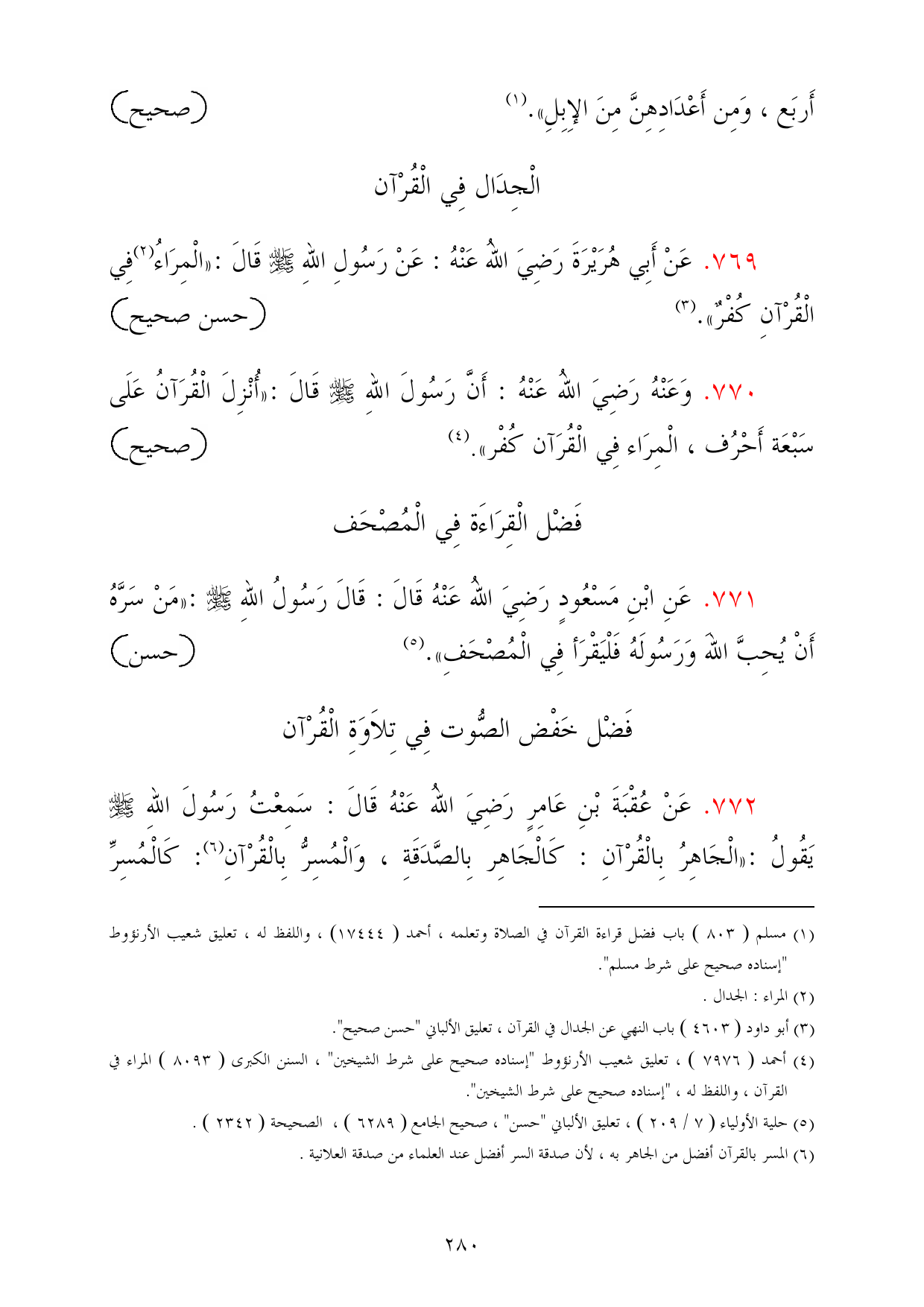 769 - عَنْ أَبِي هُرَيْرَةَ رَضِيَ اللهُ عَنْهُ: عَنْ رَسُولِ اللهِ - صلى الله عليه وسلم - قَالَ: «الْمِرَاءُ (¬2) فِي الْقُرْآنِ كُفْرٌ». (¬3) =حسن صحيح