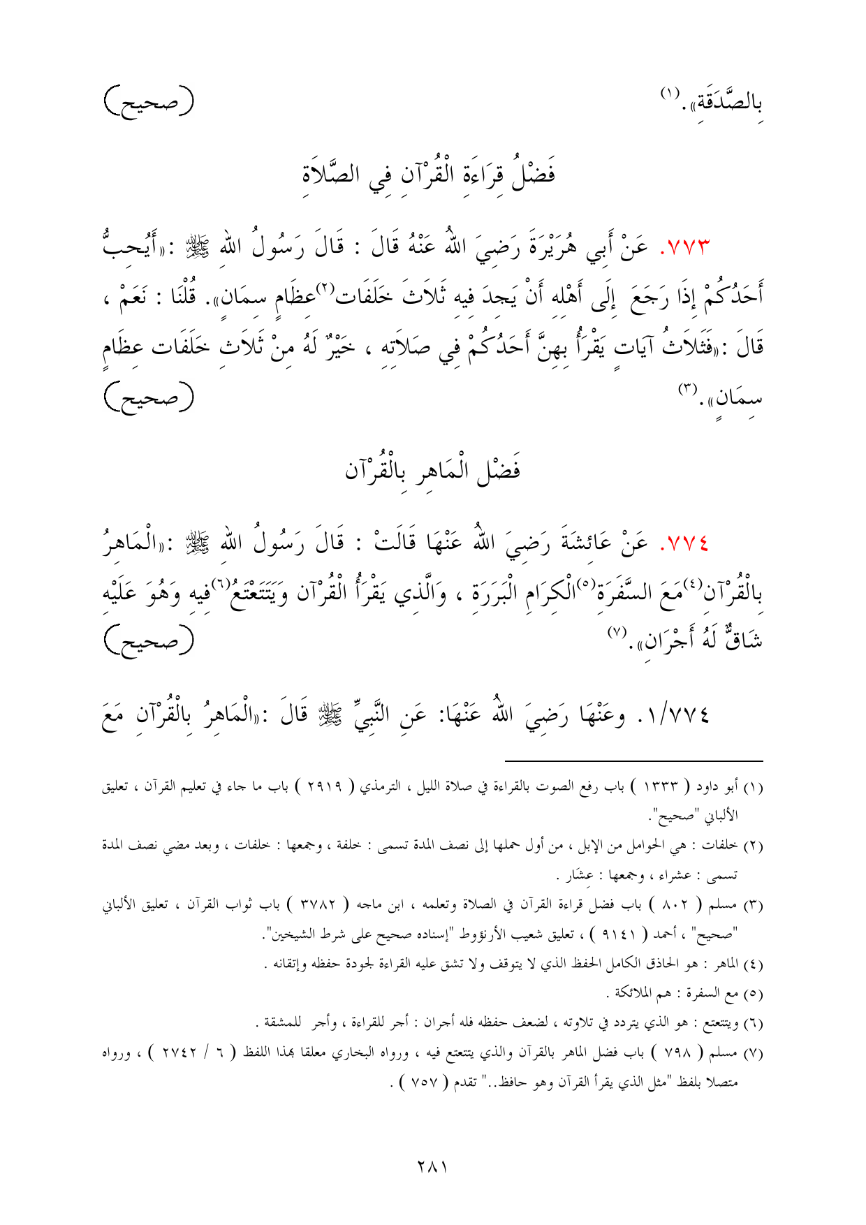 774/ 1. وعَنْهَا رَضِيَ اللهُ عَنْهَا: عَنِ النَّبِيِّ - صلى الله عليه وسلم - قَالَ: «الْمَاهِرُ بِالْقُرْآنِ مَعَ
