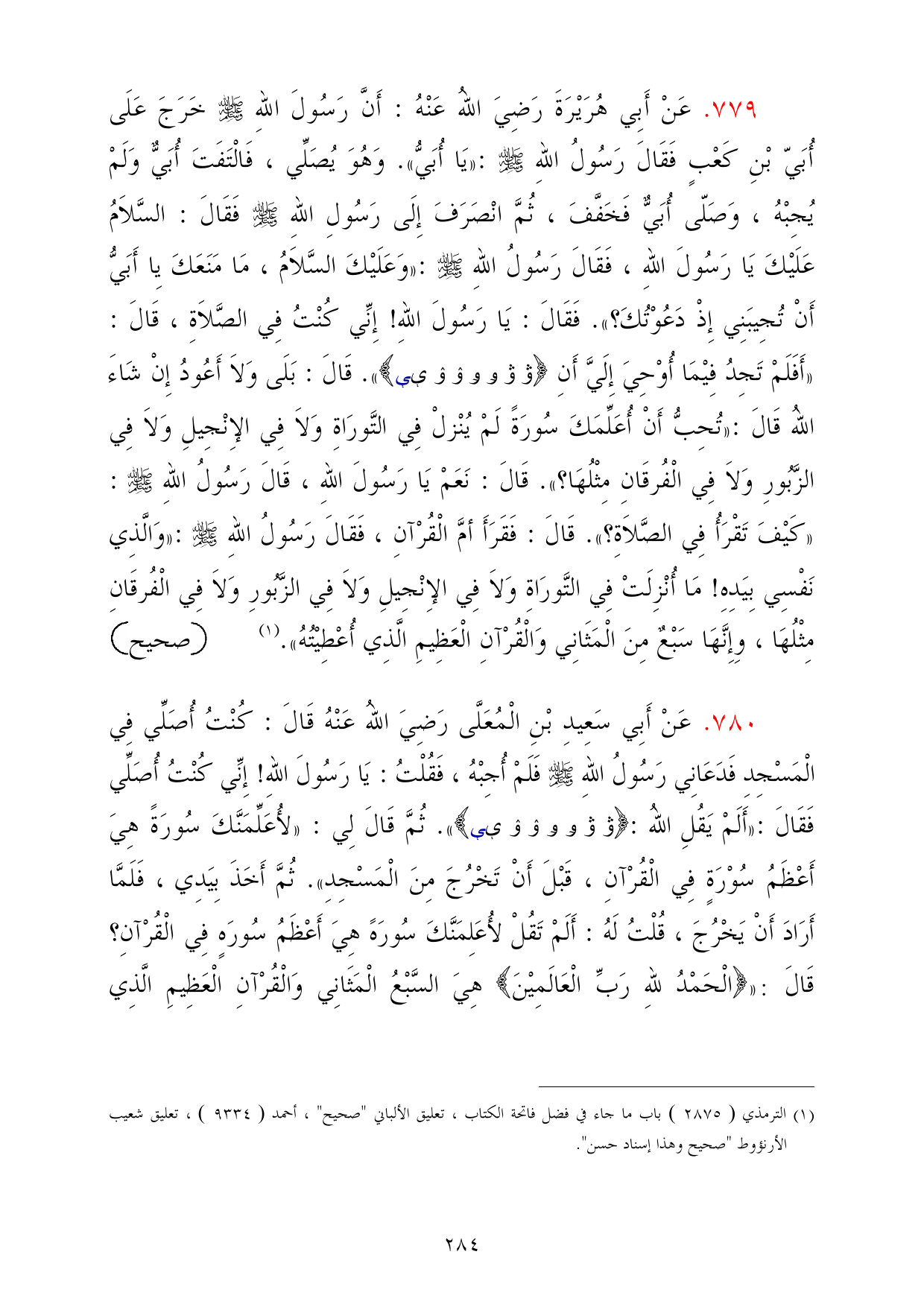 779 - عَنْ أَبِي هُرَيْرَةَ رَضِيَ اللهُ عَنْهُ: أَنَّ رَسُولَ اللهِ - صلى الله عليه وسلم - خَرَجَ عَلَى أُبَيّ بْنِ كَعْبٍ فَقَالَ رَسُولُ اللهِ - صلى الله عليه وسلم -: «يَا أُبَيُّ». وَهُوَ يُصَلِّي، فَالْتَفَتَ أُبَيٌّ وَلَمْ يُجِبْهُ، وَصَلّى أُبَيٌّ فَخَفَّفَ، ثُمَّ انْصَرَفَ إِلَى رَسُولِ اللهِ - صلى الله عليه وسلم - فَقَالَ: السَّلاَمُ عَلَيْكَ يَا رَسُولَ اللهِ، فَقَالَ رَسُولُ اللهِ - صلى الله عليه وسلم -: «وَعَلَيْكَ السَّلاَمُ، مَا مَنَعَكَ يِا أَبَيُّ أَنْ تُجِيبَنِي إِذْ دَعُوْتُكَ؟». فَقَالَ: يَا رَسُولَ اللهِ! إِنِّي كُنْتُ فِي الصَّلاَةِ، قَالَ: «أَفَلَمْ تَجِدُ فِيْمَا أُوْحِيَ إِلَيَّ أَنِ {اسْتَجِيبوُا لله وَلِلرَّسُولِ إِذَا دَعَاكُمْ لِمَا يُحْيِيكُمْ}». قَالَ: بَلَى وَلاَ أَعُودُ إِنْ شَاءَ اللهُ قَالَ: «تُحِبُّ أَنْ أُعَلِّمَكَ سُورَةً لَمْ يُنْزلْ فِي التَّورَاةِ وَلاَ فِي الإِنْجِيلِ وَلاَ فِي الزَّبُورِ وَلاَ فِي الْفُرقَانِ مِثْلُهَا؟». قَالَ: نَعَمْ يَا رَسُولَ اللهِ، قَالَ رَسُولُ اللهِ - صلى الله عليه وسلم -: «كَيْفَ تَقْرَأُ فِي الصَّلاَةِ؟». قَالَ: فَقَرَأَ أمَّ الْقُرْآنِ، فَقَالَ رَسُولُ اللهِ - صلى الله عليه وسلم -: «وَالَّذِي نَفْسِي بِيَدِهِ! مَا أُنْزِلَتْ فِي التَّورَاةِ وَلاَ فِي الإِنْجِيلِ وَلاَ فِي الزَّبُورِ وَلاَ فِي الْفُرقَانِ مِثْلُهَا، وِإِنَّهَا سَبْعٌ مِنَ الْمَثَانِي وَالْقُرْآنِ الْعَظِيمِ الَّذِي أُعْطِيْتُهُ». (¬1) =صحيح