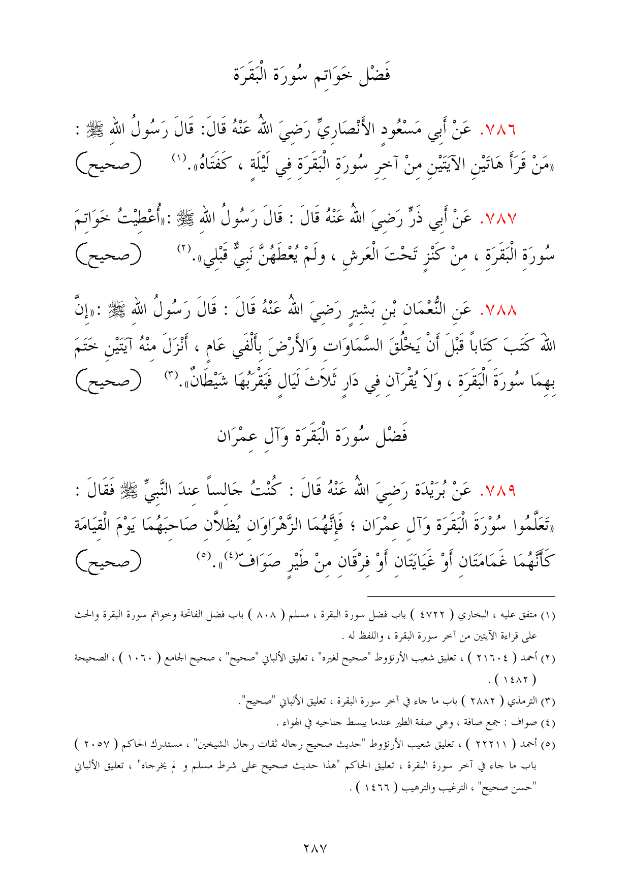 789 - عَنْ بُرَيْدَة رَضِيَ اللهُ عَنْهُ قَالَ: كُنْتُ جَالِساً عِندَ النَّبِيِّ - صلى الله عليه وسلم - فَقَالَ: «تَعَلَّمُوا سُوْرَةَ الْبَقَرَة وَآلِ عِمْرَان؛ فَإِنَّهُمَا الزَّهْرَاوَانِ يُظِلاَّنِ صَاحِبَهُمَا يَوْمَ الْقِيَامَة كَأَنَّهُمَا غَمَامَتَانِ أَوْ غَيَايَتَانِ أَوْ فِرْقَانِ مِنْ طَيْرٍ صَوَافّ (¬4)». (¬5) =صحيح