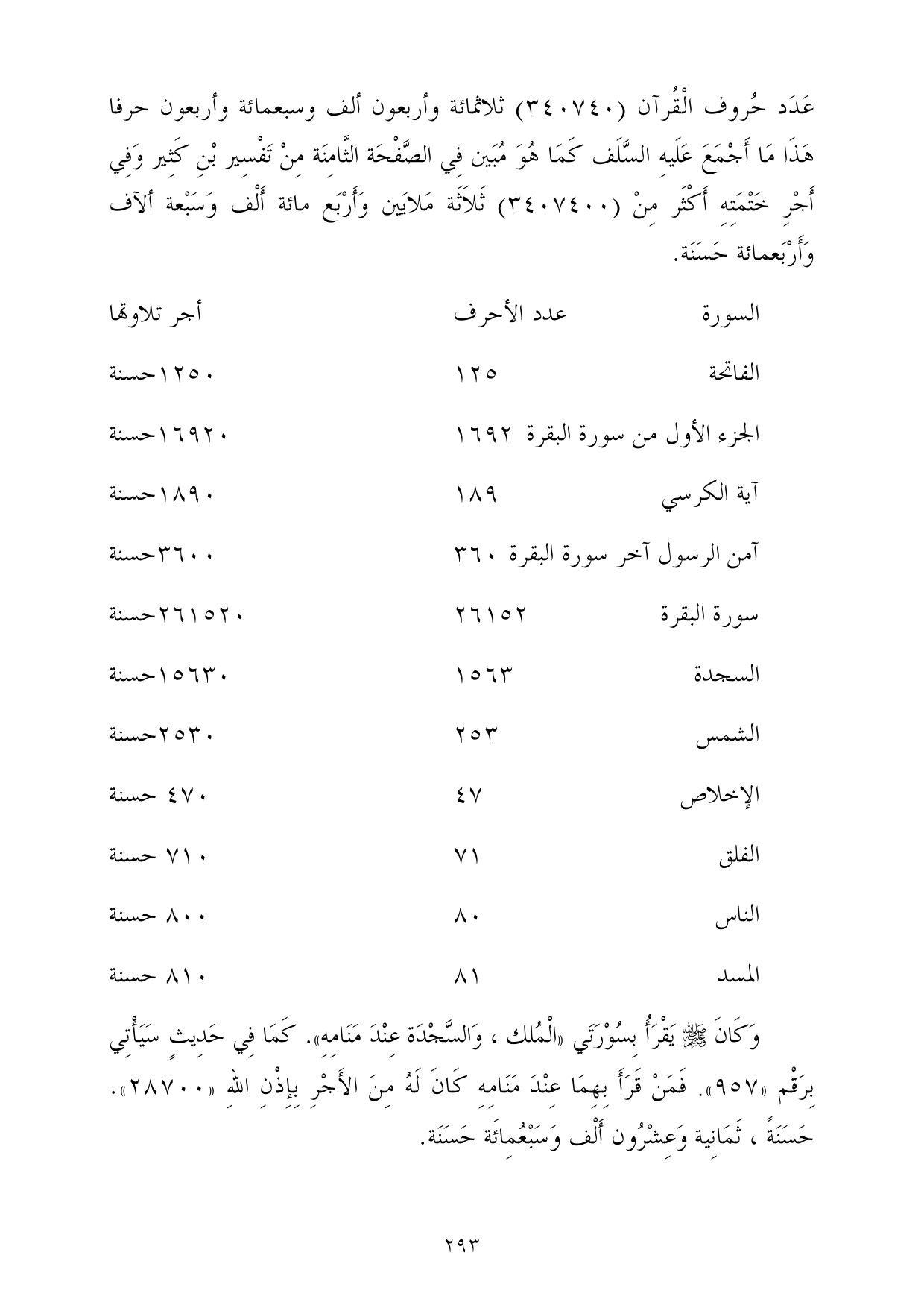 السورة ... ... عدد الأحرف ... أجر تلاوتها
