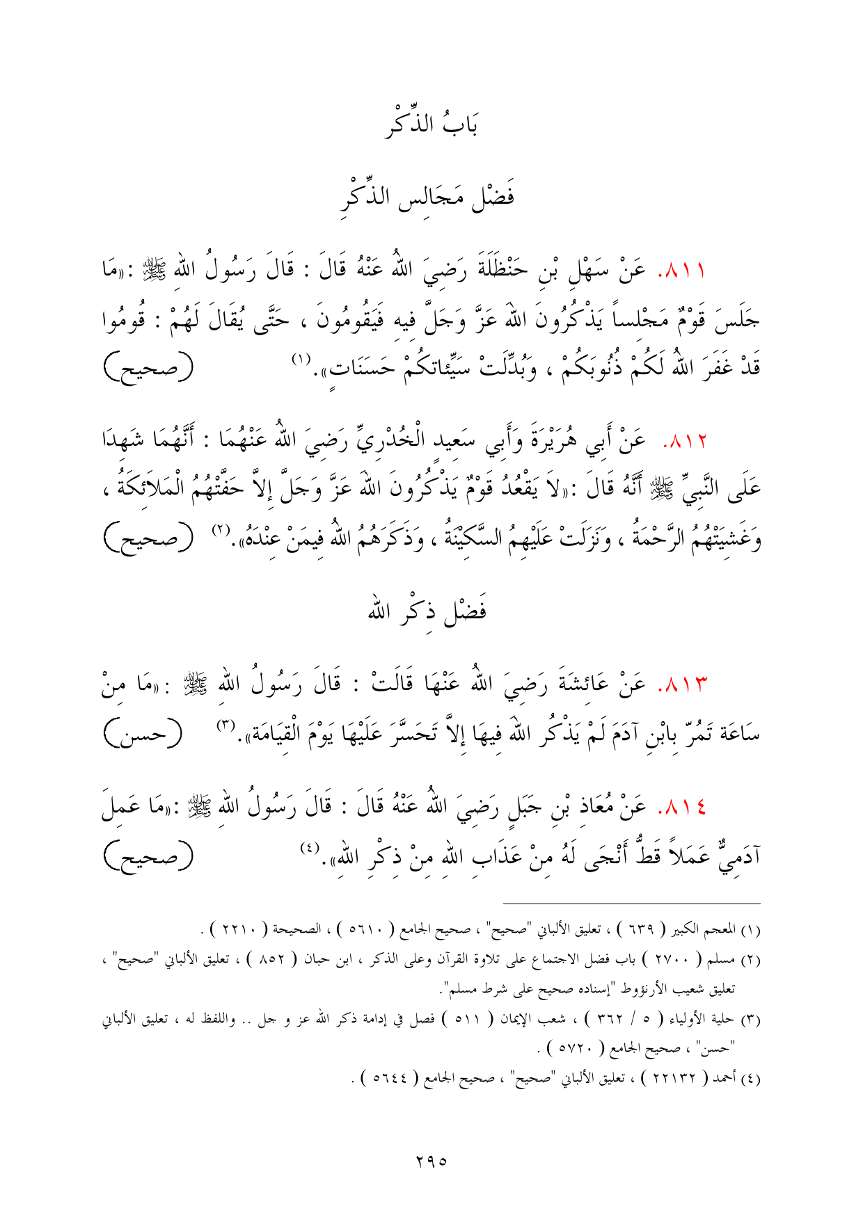 814 - عَنْ مُعَاذِ بْنِ جَبَلٍ رَضِيَ اللهُ عَنْهُ قَالَ: قَالَ رَسُولُ اللهِ - صلى الله عليه وسلم -: «مَا عَمِلَ آدَمِيٌّ عَمَلاً قَطُّ أَنْجَى لَهُ مِنْ عَذَابِ اللهِ مِنْ ذِكْرِ اللهِ». (¬4) =صحيح