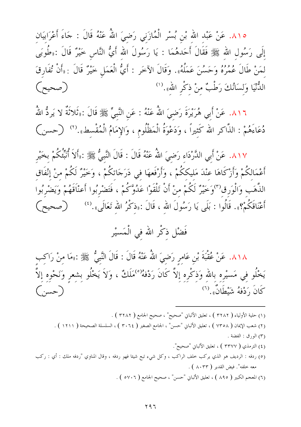817 - عَنْ أَبِي الدَّرْدَاءِ رَضِيَ اللهُ عَنْهُ قَالَ: قَالَ النَّبِيُّ - صلى الله عليه وسلم -: «أَلاَ أُنَبِّئُكُمْ بِخَيْرِ أَعْمَالِكُمْ وَأَزْكَاهَا عِنْدَ مَلِيكِكُمْ، وَأَرْفَعهَا فِي دَرَجَاتِكُمْ، وَخَيْرٌ لَكُمْ مِنْ إِنْفَاقِ الذَّهَبِ وَالْوَرِقِ (¬3) وَخَيْرٌ لَكُمْ مِنْ أَنْ تَلْقَوْا عَدُوَّكُمْ، فَتَضْرِبُوا أَعنْاَقَهُمْ وَيَضْرِبُوا أَعْنَاقَكُمْ؟». قَالُوا: بَلَى يَا رَسُولَ اللهِ، قَالَ: «ذِكْرُ اللهِ تَعَالَى». (¬4) =صحيح