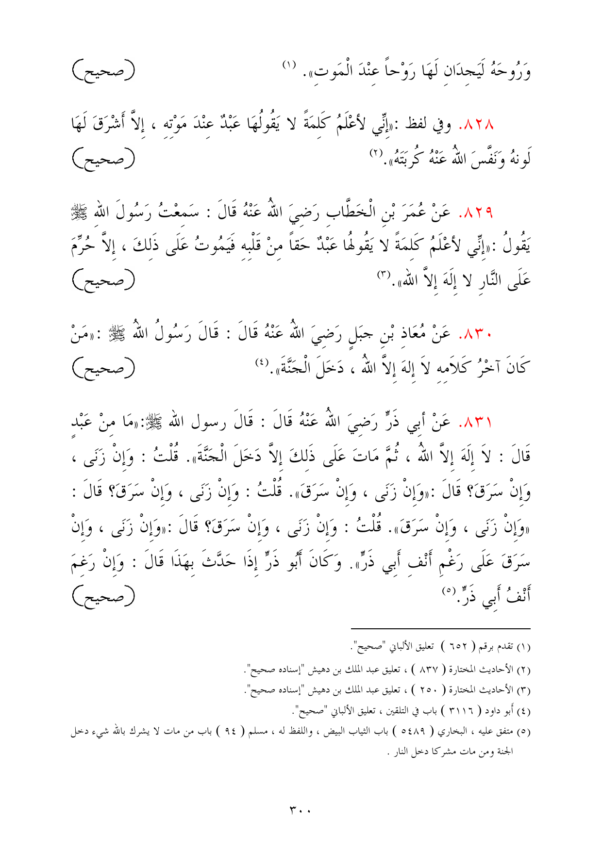 830 - عَنْ مُعَاذِ بْنِ جبَلٍ رَضِيَ اللهُ عَنْهُ قَالَ: قَالَ رَسُولُ اللهُ - صلى الله عليه وسلم -: «مَنْ كَانَ آخْرُ كَلاَمِهِ لاَ إِلهَ إِلاَّ اللهُ، دَخَلَ الْجَنَّةَ». (¬4) =صحيح