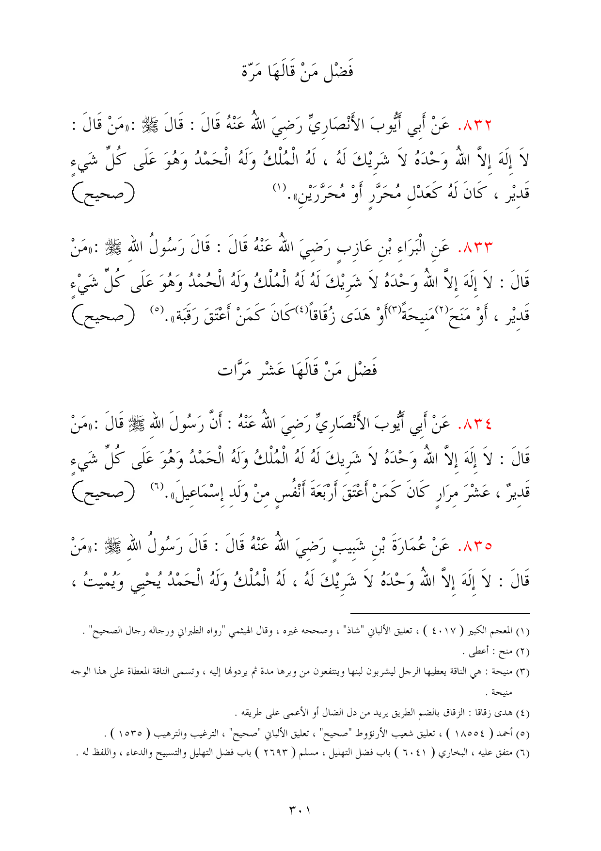 835 - عَنْ عُمَارَةَ بْنِ شَبِيبٍ رَضِيَ اللهُ عَنْهُ قَالَ: قَالَ رَسُولُ اللهِ - صلى الله عليه وسلم -: «مَنْ قَالَ: لاَ إِلَهَ إِلاَّ اللهُ وَحْدَهُ لاَ شَرِيْكَ لَهُ، لَهُ الْمُلْكُ وَلَهُ الْحَمْدُ يُحْيِي وَيُمْيتُ،