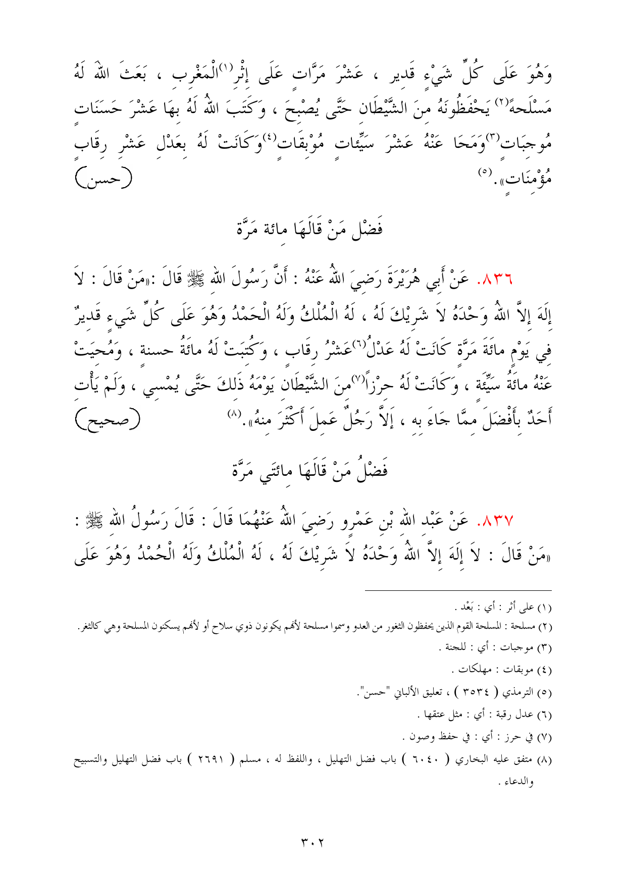 837 - عَنْ عَبْدِ اللهِ بْنِ عَمْرٍو رَضِيَ اللهُ عَنْهُمَا قَالَ: قَالَ رَسُولُ اللهِ - صلى الله عليه وسلم -: «مَنْ قَالَ: لاَ إِلَهَ إِلاَّ اللهُ وَحْدَهُ لاَ شَرِيْكَ لَهُ، لَهُ الْمُلْكُ وَلَهُ الْحُمْدُ وَهُوَ عَلَى