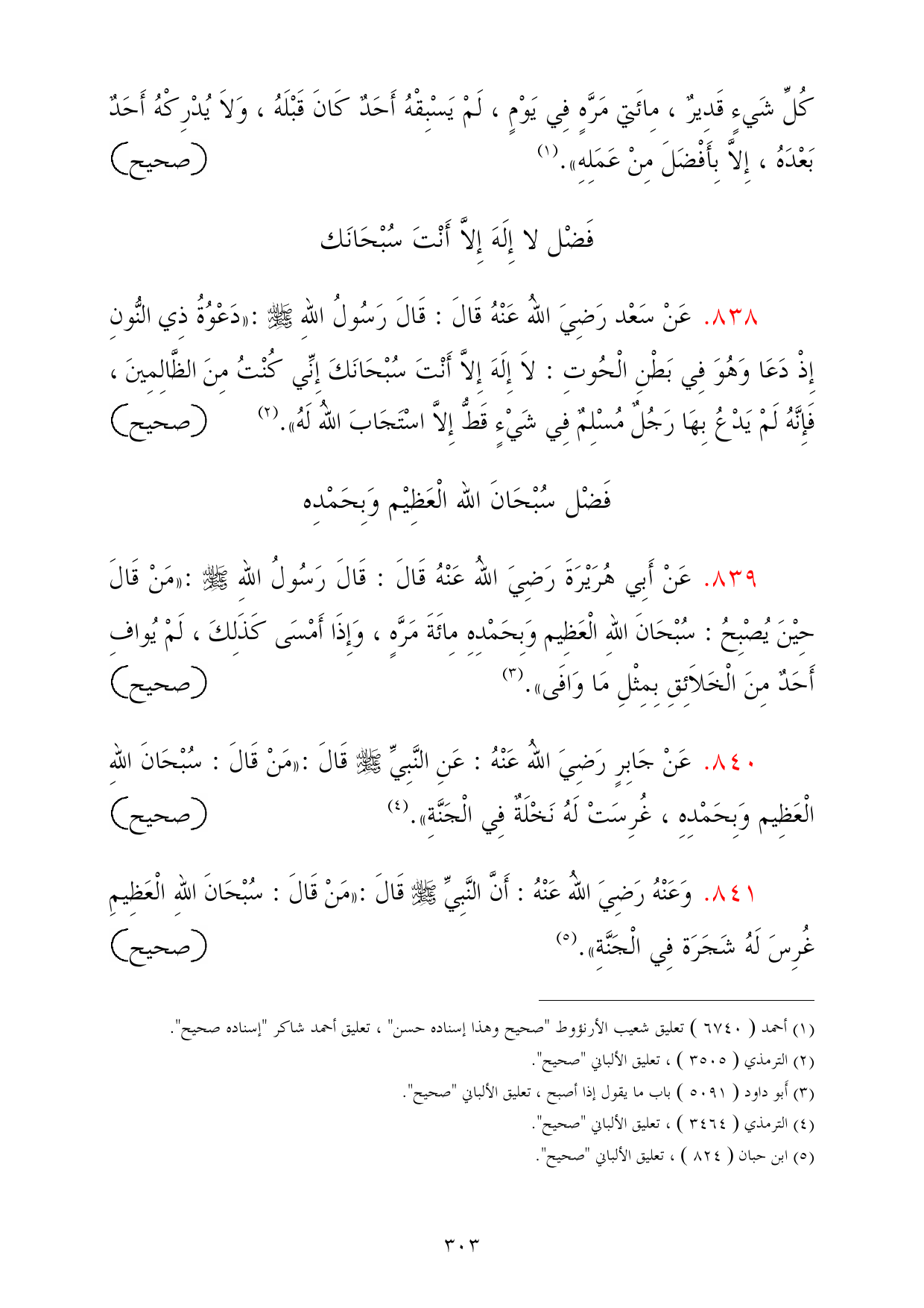 840 - عَنْ جَابِرٍ رَضِيَ اللهُ عَنْهُ: عَنِ النَّبِيِّ - صلى الله عليه وسلم - قَالَ: «مَنْ قَالَ: سُبْحَانَ اللهِ الْعَظِيم وَبِحَمْدِهِ، غُرِسَتْ لَهُ نَخْلَةٌ فِي الْجَنَّةِ». (¬4) =صحيح
