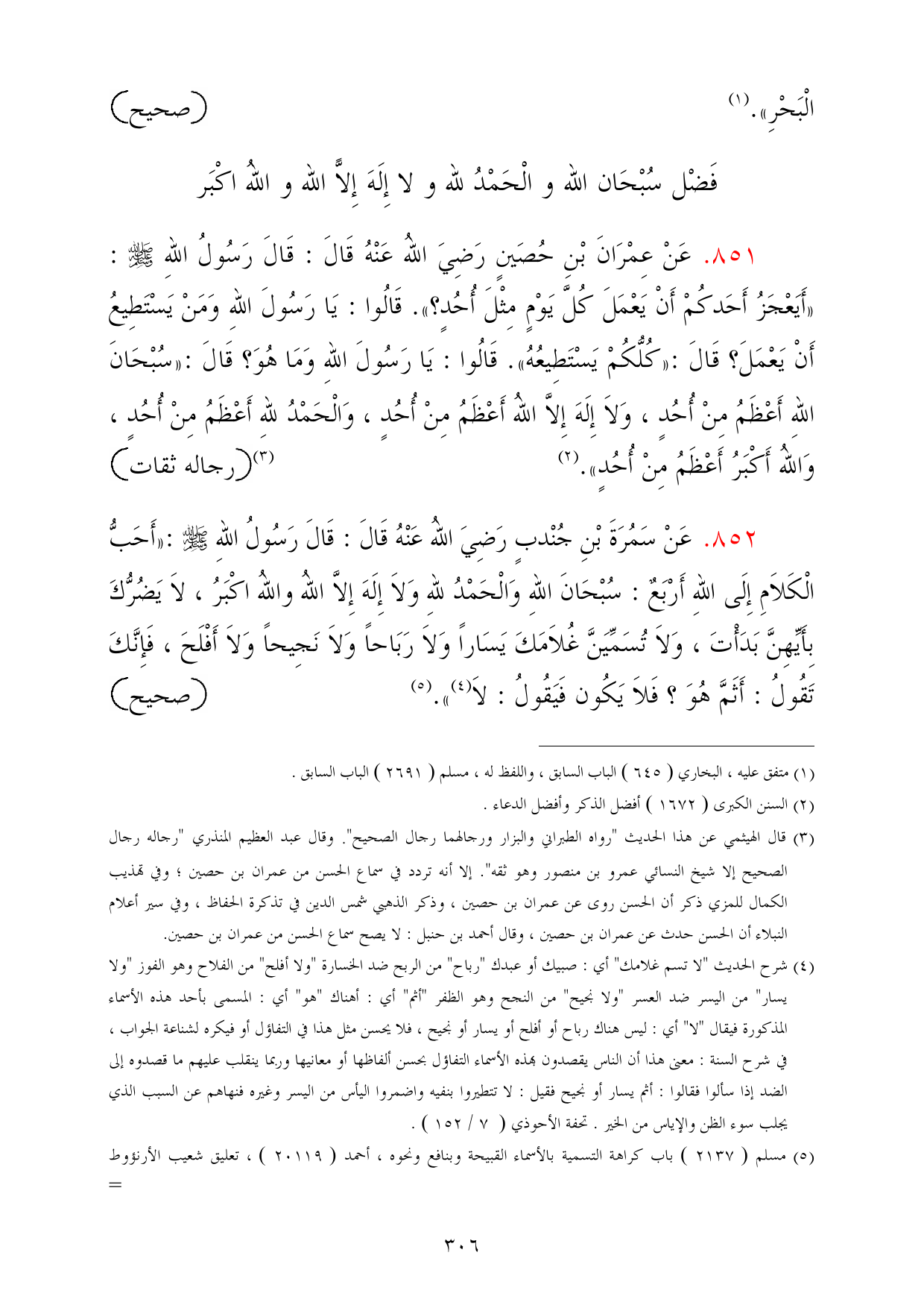 852 - عَنْ سَمُرَةَ بْنِ جُنْدبٍ رَضِيَ اللهُ عَنْهُ قَالَ: قَالَ رَسُولُ اللهِ - صلى الله عليه وسلم -: «أَحَبُّ الْكَلاَمِ إِلَى اللهِ أَرْبَعٌ: سُبْحَانَ اللهِ وَالْحَمْدُ للهِ وَلاَ إِلَهَ إِلاَّ اللهُ واللهُ اكْبَرُ، لاَ يَضُرُّكَ بِأَيِّهِنَّ بَدَأْتَ، وَلاَ تُسَمِّيَنَّ غُلاَمَكَ يَسَاراً وَلاَ رَبَاحاً وَلاَ نَجِيحاً وَلاَ أَفْلَحَ، فَإِنَّكَ تَقُولُ: أَثَمَّ هُوَ؟ فَلاَ يَكُون فَيَقُولُ: لاَ (¬4)». (¬5) =صحيح