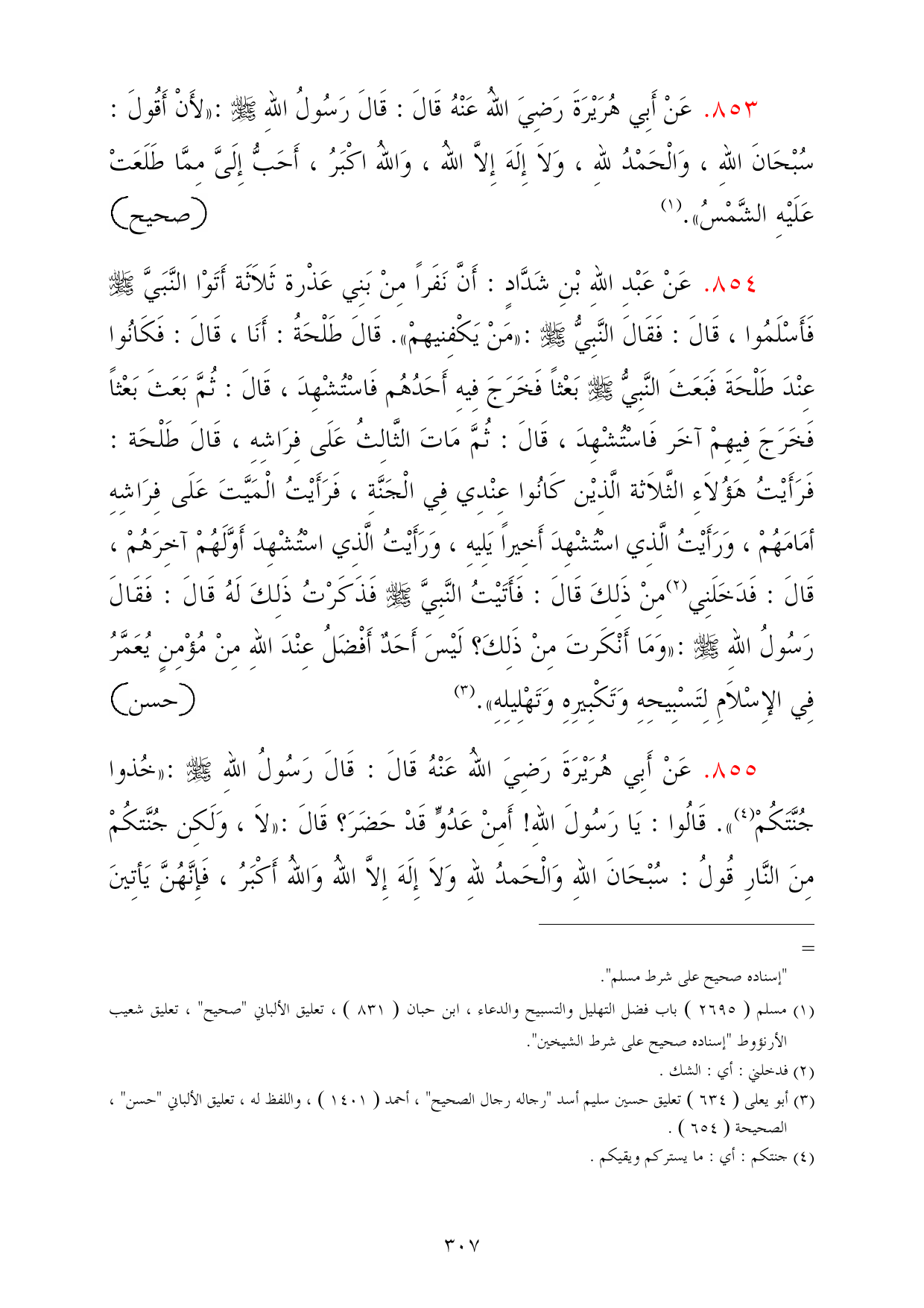 855 - عَنْ أَبِي هُرَيْرَةَ رَضِيَ اللهُ عَنْهُ قَالَ: قَالَ رَسُولُ اللهِ - صلى الله عليه وسلم -: «خُذوا جُنَّتَكُمْ (¬4)». قَالُوا: يَا رَسُولَ اللهِ! أَمِنْ عَدُوٍّ قَدْ حَضَرَ؟ قَالَ: «لاَ، وَلَكِن جُنَّتكُمْ مِنَ النَّارِ قُولُ: سُبْحَانَ اللهِ وَالْحَمدُ للهِ وَلاَ إِلَهَ إِلاَّ اللهُ وَاللهُ أَكْبَرُ، فَإِنَّهُنَّ يَأتِينَ