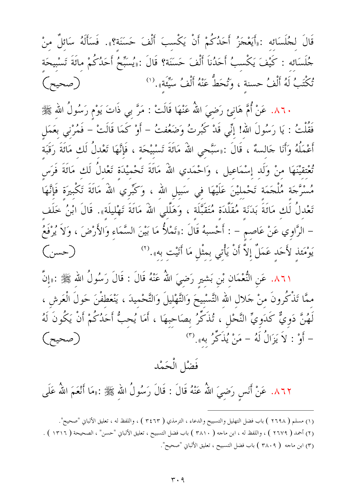 860 - عَنْ أُمَّ هَانِئ رَضِيَ اللهُ عَنْهَا قَالَتْ: مَرَّ بِي ذَاتَ يَوْمٍ رَسُولُ اللهِ - صلى الله عليه وسلم - فَقُلْتُ: يَا رَسُولَ اللهِ! إِنِّي قَدْ كَبُرتُ وَضَعُفتُ - أَوْ كَمَا قَالَتْ - فَمُرْنِي بِعَمَلٍ أَعْمَلُهُ وَأَنَا جَالِسهٌ، قَالَ: «سَبَّحِي اللهَ مَائَةَ تَسْبِيْحَةٍ، فَإِنَّهَا تَعْدِلُ لَكِ مَائَةَ رَقَبَةٍ تُعْتِقِيْنَهَا مِنْ وَلَدِ إِسْمَاعِيل، وَاحْمَدِي اللهَ مَائَةَ تَحْمِيْدَةٍ تَعْدِلُ لَكِ مَائَةَ فَرَسٍ مُسْرَّجَةٍ مُلْجَمَةٍ تَحْمِلِيْنَ عَلَيْهَا فِي سَبيِلِ اللهِ، وَكَبِّرِي اللهَ مَائَةَ تَكْبِيرَةٍ فَإِنَّهَا تَعْدِلُ لَكِ مَائَةَ بَدَنَةٍ مُقَلَّدَةٍ مُتَقَبَّلَةٍ، وَهَلَّلِي اللهَ مَائَةَ تَهْلِيلَةٍ». قَالَ ابْنُ خَلَفٍ - الرَّاوِي عَنْ عَاصِمٍ -: أَحْسبهُ قَالَ: «تَمْلأُ مَا بَيْنَ السَّمَاءِ وَالأَرْضَ، وَلاَ يُرْفَعُ يَوْمَئذٍ لأَحَدٍ عَمَلٌ إِلاَّ أَنْ يَأْتِي بِمِثْلِ مَا أَتَيْتِ بِهِ». (¬2) =حسن