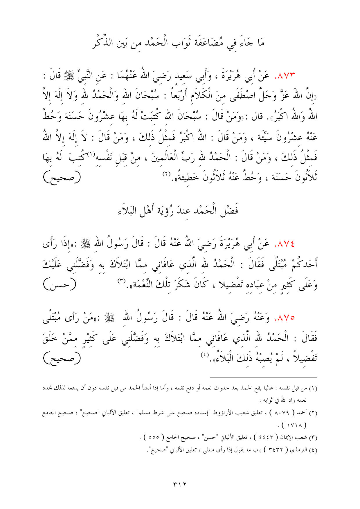 875 - وَعَنْهُ رَضِيَ اللهُ عَنْهُ قَالَ: قَالَ رَسُولُ اللهِ - صلى الله عليه وسلم -: «مَنْ رَأى مُبْتَلًى فَقَالَ: الْحَمْدُ للهِ الَّذِي عَافَانِي مِمَّا ابْتَلاَكَ بِهِ وَفَضَّلَنِي عَلَى كَثِيْرٍ مِمَّنْ خَلَقَ تَفْضِيلاً، لَمْ يُصِبْهُ ذَلِكَ الْبَلاَءُ». (¬4) =صحيح