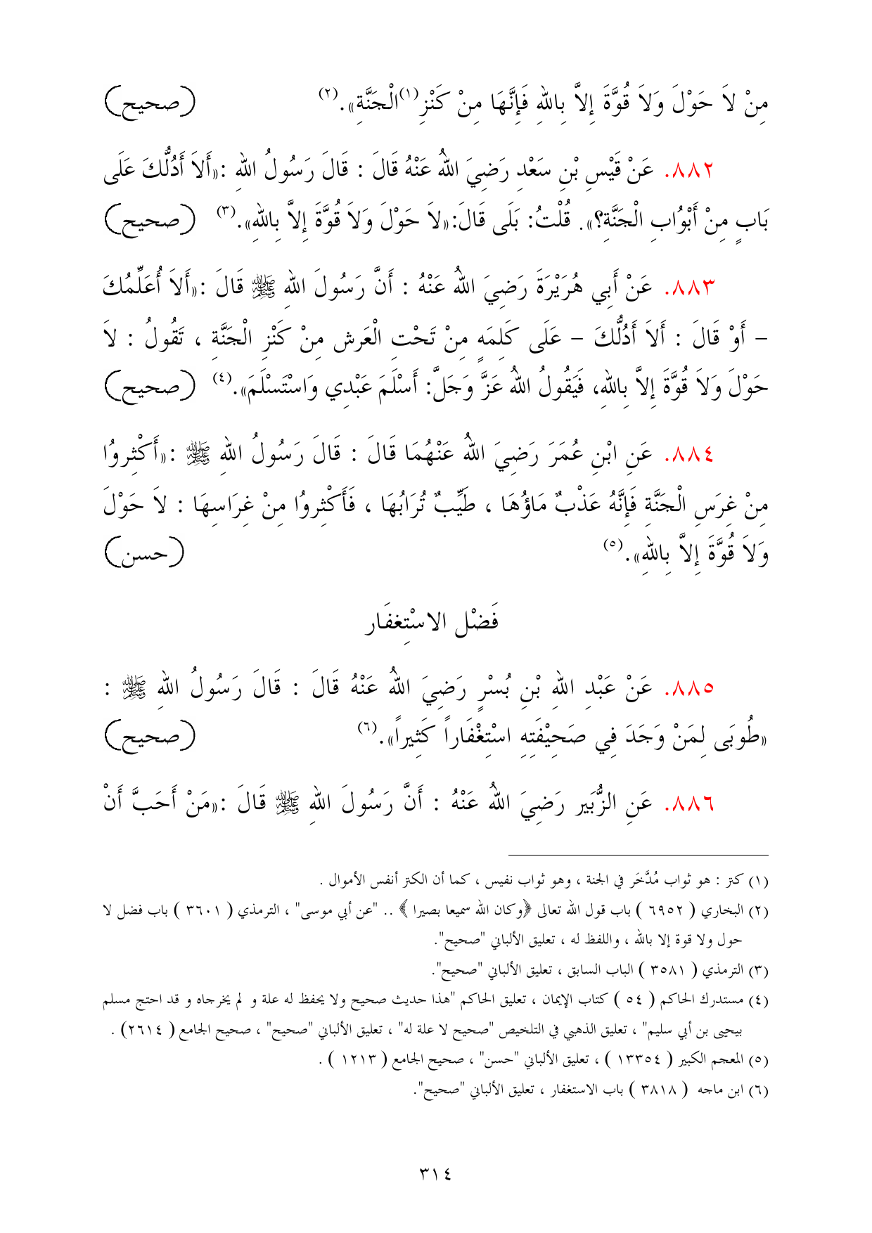 884 - عَنِ ابْنِ عُمَرَ رَضِيَ اللهُ عَنْهُمَا قَالَ: قَالَ رَسُولُ اللهِ - صلى الله عليه وسلم -: «أَكْثِروُا مِنْ غِرَسِ الْجَنَّةِ فَإِنَّهُ عَذْبٌ مَاؤُهَا، طَيِّبٌ تُرَابُهَا، فَأَكْثِروُا مِنْ غِرَاسِهَا: لاَ حَوْلَ وَلاَ قُوَّةَ إِلاَّ بِاللهِ». (¬5) =حسن