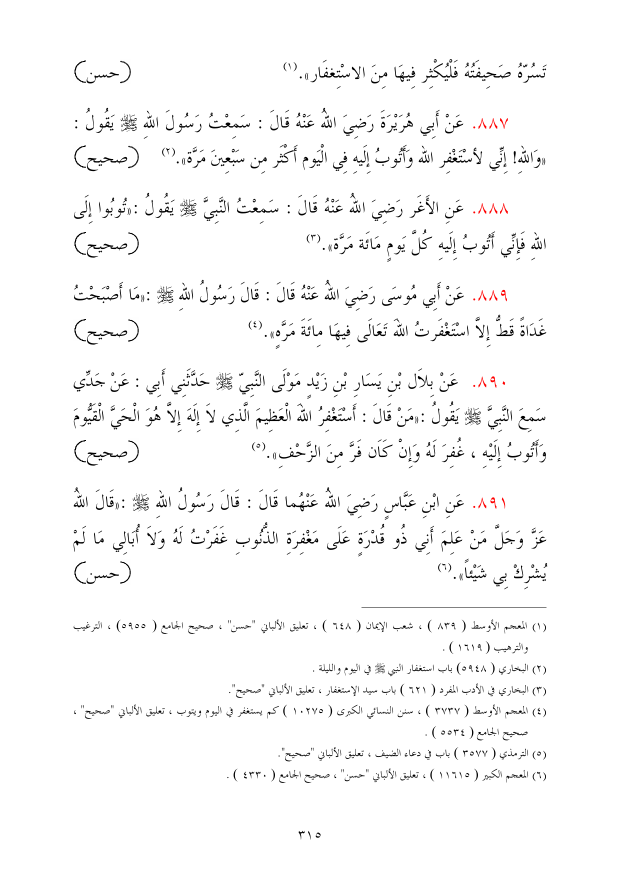 889 - عَنْ أَبِي مُوسَى رَضِيَ اللهُ عَنْهُ قَالَ: قَالَ رَسُولُ اللهِ - صلى الله عليه وسلم -: «مَا أَصْبَحْتُ غَدَاةً قَطُّ إِلاَّ اسْتَغْفَرتُ اللهَ تَعَالَى فِيهَا مِائَةَ مَرَّهٍ». (¬4) =صحيح