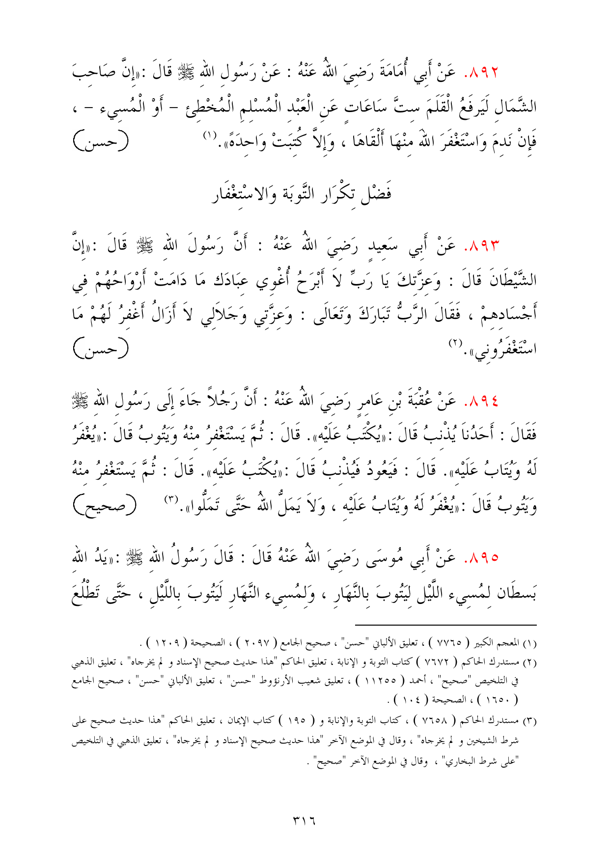 (¬2) مستدرك الحاكم (7672) كتاب التوبة والإنابة، تعليق الحاكم "هذا حديث صحيح الإسناد ولم يخرجاه"، تعليق الذهبي في التلخيص "صحيح"، أحمد (11255)، تعليق شعيب الأرنؤوط "حسن"، تعليق الألباني "حسن"، صحيح الجامع (1650)، الصحيحة (104).