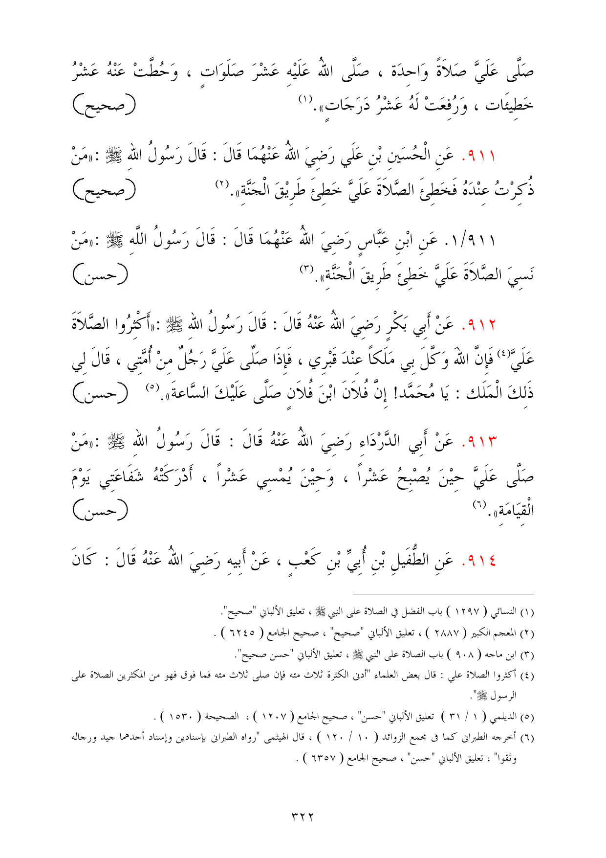 913 - عَنْ أَبِي الدَّرْدَاءِ رَضِيَ اللهُ عَنْهُ قَالَ: قَالَ رَسُولُ اللهِ - صلى الله عليه وسلم -: «مَنْ صَلَّى عَلَيَّ حِيْنَ يُصْبِحُ عَشْراً، وَحِيْنَ يُمْسِي عَشْراً، أَدْرَكَتْهُ شَفَاعَتِي يَوْمَ الْقِيَامَةِ». (¬6) =حسن
