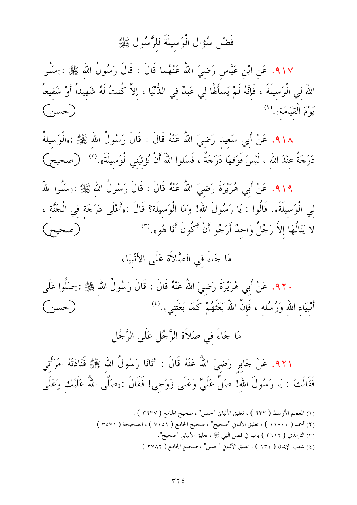 920 - عَنْ أَبِي هُرَيْرَةَ رَضِيَ اللهُ عَنْهُ قَالَ: قَالَ رَسُولُ اللهِ - صلى الله عليه وسلم -: «صَلُّوا عَلَى أَنْبِيَاءِ اللهِ وَرُسُلهِ، فَإِنَّ اللهَ بَعَثَهُمْ كَمَا بَعَثَنِي». (¬4) =حسن