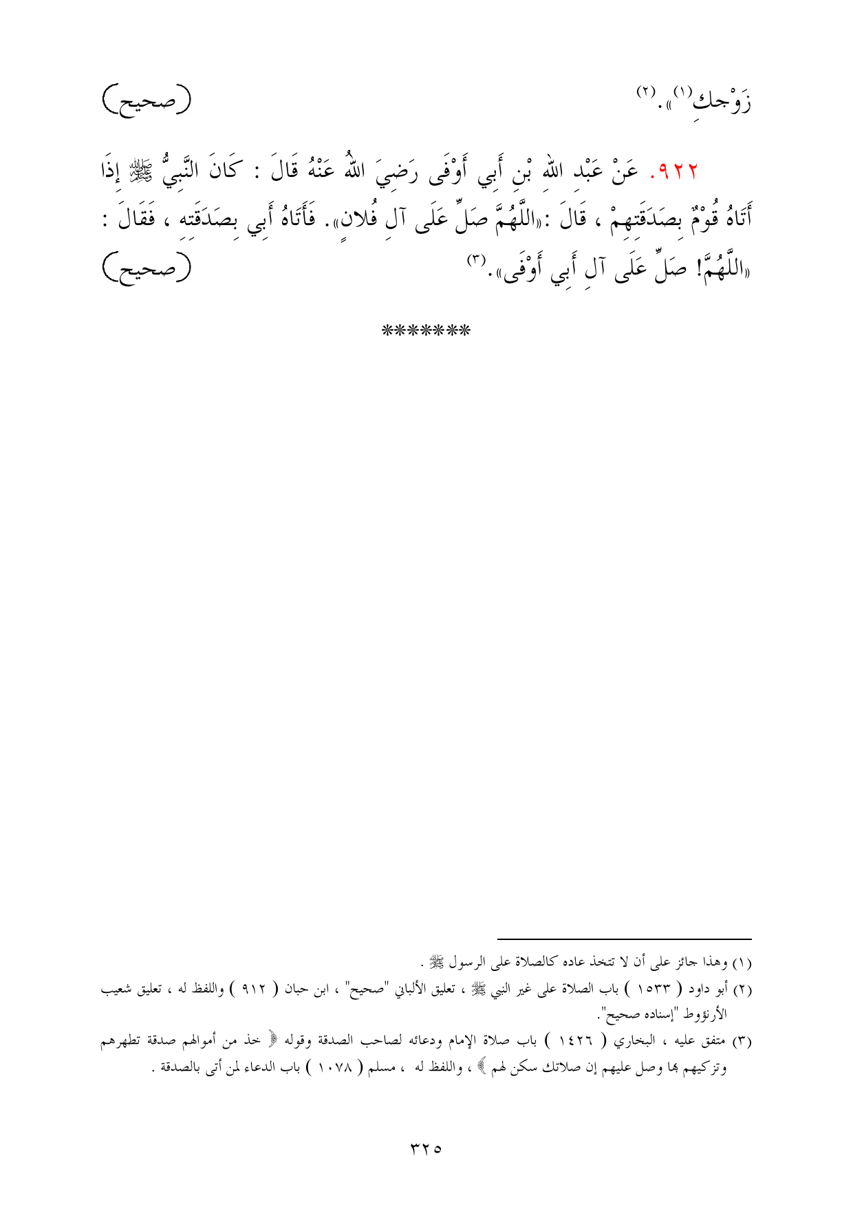922 - عَنْ عَبْدِ اللهِ بْنِ أَبِي أَوْفَى رَضِيَ اللهُ عَنْهُ قَالَ: كَانَ النَّبِيُّ - صلى الله عليه وسلم - إِذَا أَتَاهُ قُوْمٌ بِصَدَقَتِهِمْ، قَالَ: «اللَّهُمَّ صَلِّ عَلَى آلِ فُلانٍ». فَأَتَاهُ أَبِي بِصَدَقَتِهِ، فَقَالَ: «اللَّهُمَّ! صَلِّ عَلَى آلِ أَبِي أَوْفَى». (¬3) =صحيح