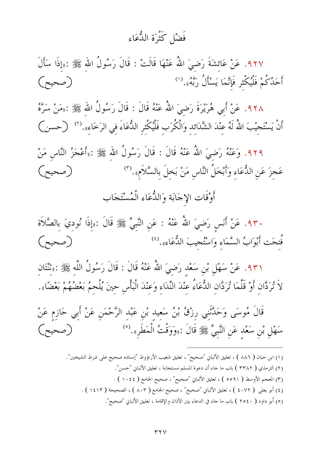 930 - عَنْ أَنَسٍ رَضِيَ اللهُ عَنْهُ: عَنِ النَّبِيِّ - صلى الله عليه وسلم - قَالَ: «إِذَا نُودِيَ بِالصَّلاَة فُتِحَت أَبْوَابُ السَّمَاءِ وَاسْتُجِيبَ الدُّعَاء». (¬4) =صحيح