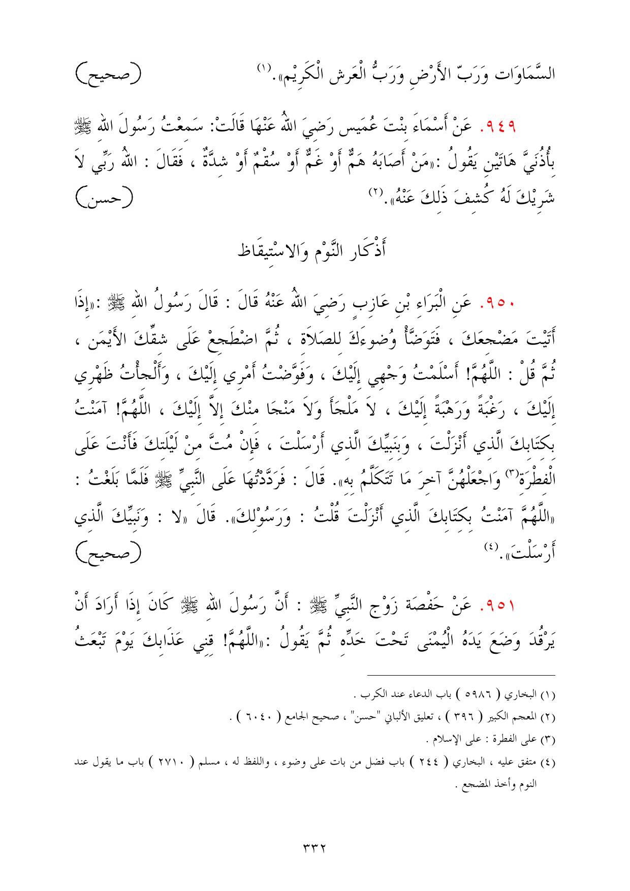 951 - عَنْ حَفْصَة زَوْج النَّبِيِّ - صلى الله عليه وسلم -: أَنَّ رَسُولَ اللهِ - صلى الله عليه وسلم - كَانَ إِذَا أَرَادَ أَنْ يَرْقُدَ وَضَعَ يَدَهُ الْيُمْنَى تَحْتَ خَدِّهِ ثُمَّ يَقُولُ: «اللَّهُمَّ! قِنِي عَذَابِكَ يَوْمَ تَبْعَثُ