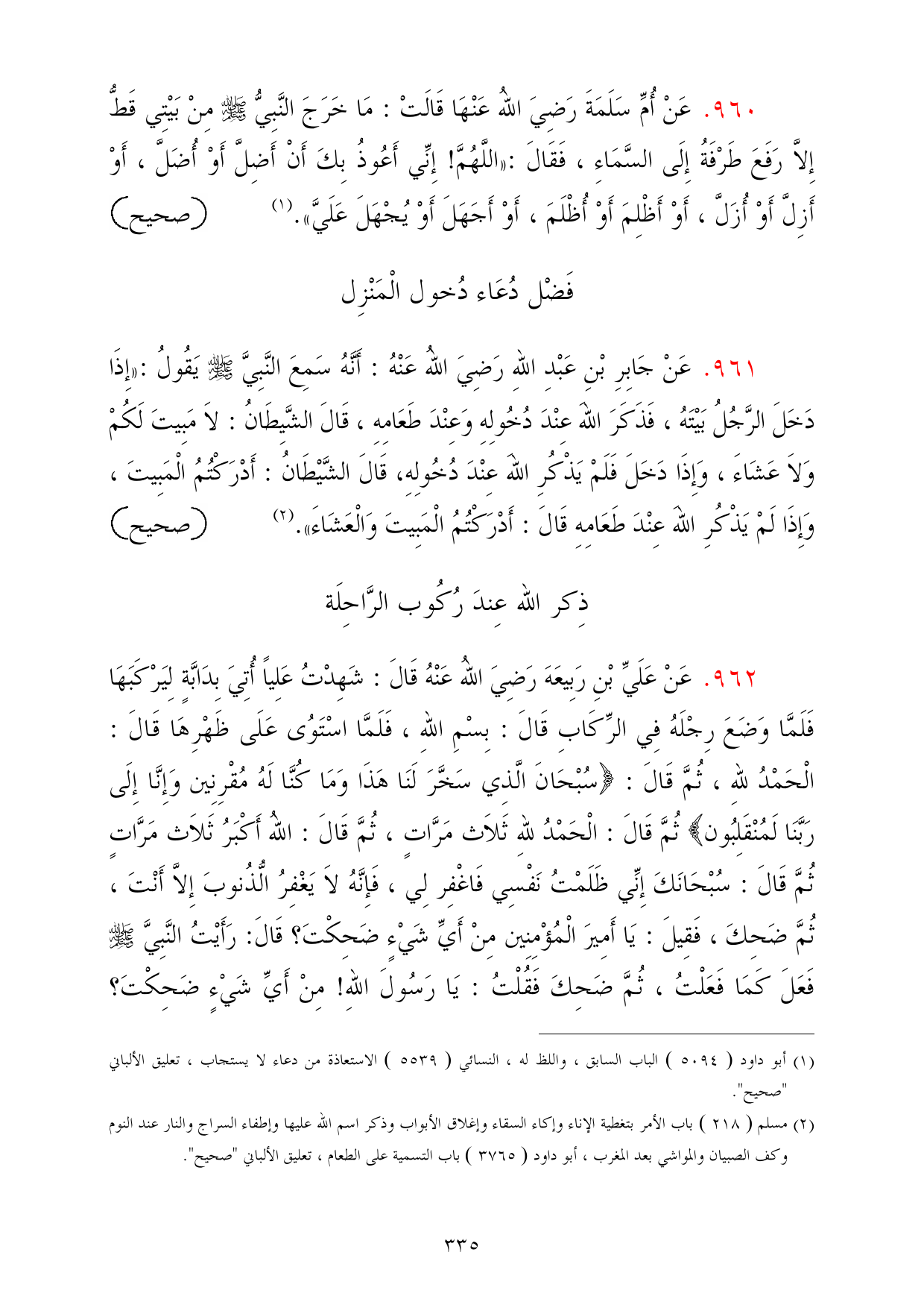 962 - عَنْ عَلَيِّ بْنِ رَبِيعَهَ رَضِيَ اللهُ عَنْهُ قَالَ: شَهِدْتُ عَلِياً أُتِيَ بِدَابَّةٍ لِيَرْكَبَهَا فَلَمَّا وَضَعَ رِجْلَهُ فِي الرِّكَابِ قَالَ: بِسْمِ اللهِ، فَلَمَّا اسْتَوُى عَلَى ظَهْرِهَا قَالَ: الْحَمْدُ للهِ، ثُمَّ قَالَ: {سُبْحَانَ الَّذِي سَخَّرَ لَنَا هَذَا وَمَا كُنَّا لَهُ مُقْرِنِين وَإِنَّا إِلَى رَبَّنَا لَمُنْقَلِبُون} ثُمَّ قَالَ: الْحَمْدُ للهِ ثَلاَث مَرَّاتٍ، ثُمَّ قَالَ: اللهُ أَكْبَرُ ثَلاَث مَرَّاتٍ ثُمَّ قَالَ: سُبْحَانَكَ إِنِّي ظَلَمْتُ نَفْسِي فَاغْفِر لِي، فَإِنَّهُ لاَ يَغْفِرُ الُّذُنوبَ إِلاَّ أَنْتَ، ثُمَّ ضَحِكَ، فَقِيلَ: يَا أَمِيرَ الْمُؤْمِنِين مِنْ أَيِّ شَيْءٍ ضَحِكْتَ؟ قَالَ: رَأَيْتُ النَّبِيَّ - صلى الله عليه وسلم - فَعَلَ كَمَا فَعَلْتُ، ثُمَّ ضَحِكَ فَقُلْتُ: يَا رَسُولَ اللهِ! مِنْ أَيِّ شَيْءٍ ضَحِكْتَ؟