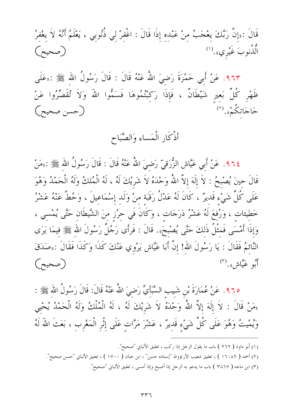 965 - عَنْ عُمَارَةَ بْنِ شَبِيبٍ السَّبَأِيِّ رَضِيَ اللهُ عَنْهُ قَالَ: قَالَ رَسُولُ اللهِ - صلى الله عليه وسلم -: «مَنْ قَالَ: لاَ إِلَهَ إِلاَّ اللهُ وَحْدَهُ لاَ شَرِيْكَ لَهُ، لَهُ الْمُلْكُ وَلَهُ الْحَمْدُ يُحْيِي وَيُمْيتُ وَهُوَ عَلَى كُلِّ شَيْءٍ قَدِيرٌ، عَشْرَ مَرَّاتٍ عَلَى إِثْرِ الْمَغْرِبِ، بَعَثَ اللهَ لَهُ