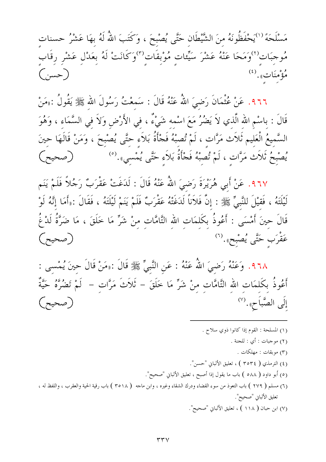 966 - عَنْ عُثْمَانَ رَضِيَ اللهُ عَنْهُ قَالَ: سَمِعْتُ رَسُولَ اللهِ - صلى الله عليه وسلم - يَقُولُ: «مَنْ قَالَ: بِاسْمِ اللهِ الَّذِي لاَ يَضُرُ مَعَ اسْمِهِ شَيْءٌ، فِي الأَرْضِ وَلاَ فِي السَّمَاءِ، وَهُوَ السَّمِيعُ الْعَلِيم ثَلاَث مَرَّاتٍ، لَمْ تُصِبْهُ فَجْأَةُ بَلاَءٍ حِتَّى يُصْبِحَ، وَمَنْ قَالَهَا حِينَ يُصْبِحُ ثَلاَث مَرَّاتٍ، لَمْ تُصِبْهُ فَجْأَةُ بَلاَءٍ حَتَّى يُمْسِي». (¬5) =صحيح