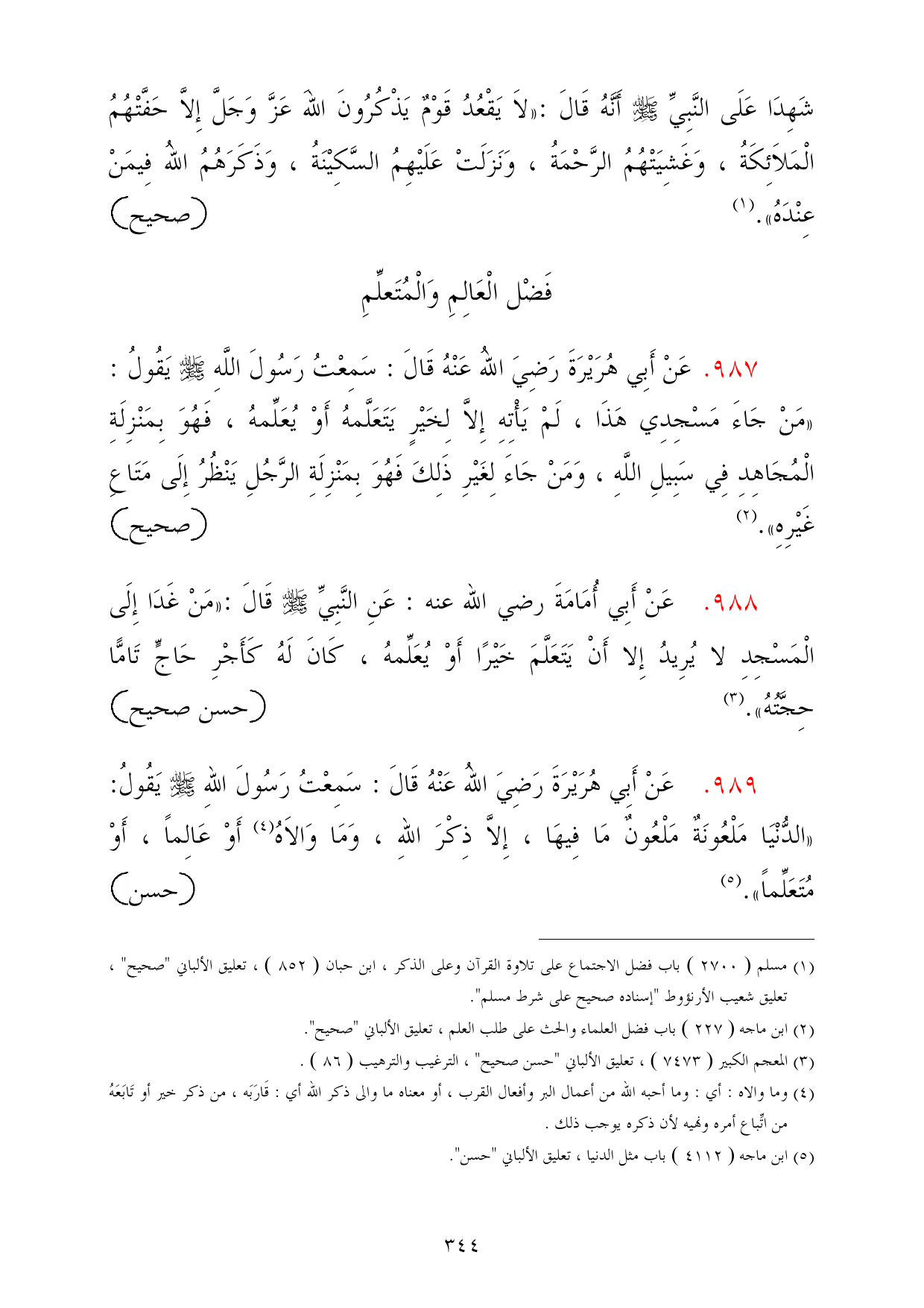 988 - عَنْ أَبِي أُمَامَةَ رضي الله عنه: عَنِ النَّبِيِّ - صلى الله عليه وسلم - قَالَ: «مَنْ غَدَا إِلَى الْمَسْجِدِ لا يُرِيدُ إِلا أَنْ يَتَعَلَّمَ خَيْرًا أَوْ يُعَلِّمهُ، كَانَ لَهُ كَأَجْرِ حَاجٍّ تَامًّا حِجَّتُهُ». (¬3) =حسن صحيح
