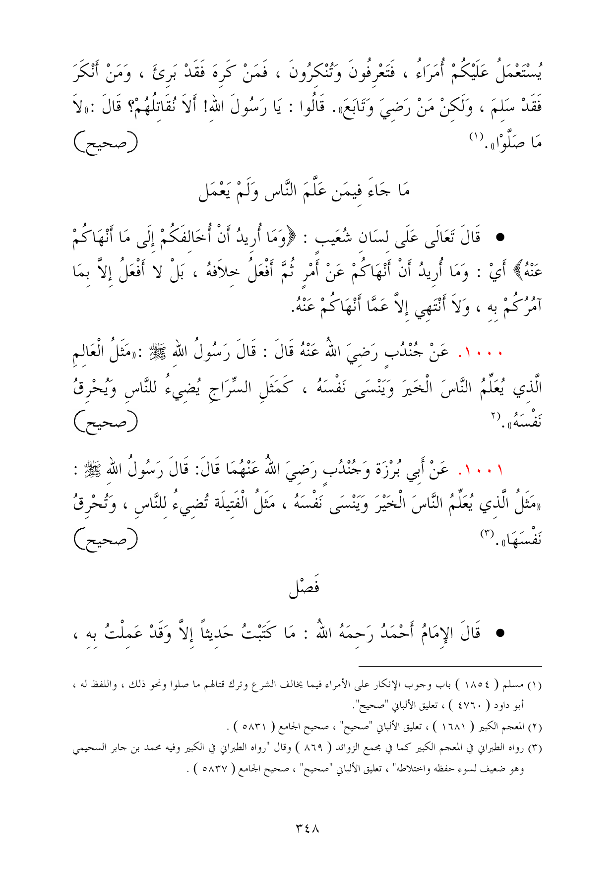 1000 - عَنْ جُنْدُبٍ رَضِيَ اللهُ عَنْهُ قَالَ: قَالَ رَسُولُ اللهِ - صلى الله عليه وسلم -: «مَثَلُ الْعَالِمِ الَّذِي يُعَلِّمُ النَّاسَ الْخَيرَ وَيَنْسَى نَفْسَهُ، كَمَثَلِ السِّرَاجِ يُضِيءُ للنَّاسِ وَيُحْرِقُ نَفْسَهُ». (¬2) =صحيح