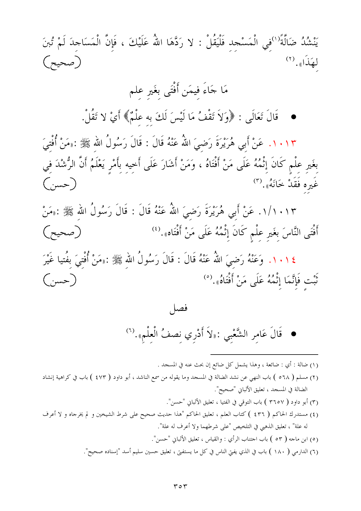 1013/ 1. عَنْ أَبِي هُرَيْرَةَ رَضِيَ اللهُ عَنْهُ قَالَ: قَالَ رَسُولُ اللهِ - صلى الله عليه وسلم -: «مَنْ أَفْتَى النَّاسَ بِغَيرِ عِلْمٍ كَانَ إِثْمُهُ عَلَى مَنْ أَفْتَاه». (¬4) =صحيح