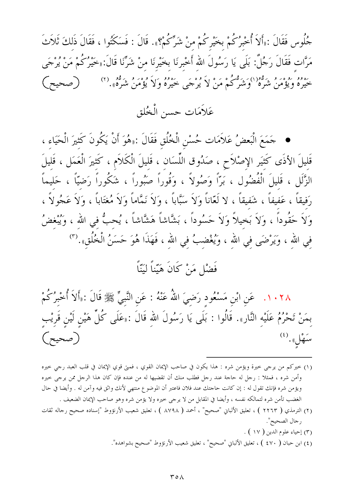 (¬1) خيركم من يرجى خيرة ويؤمن شره: هذا يكون في صاحب الإيمان القوي، فمتى قوي الإيمان في قلب العبد رجي خيره وأمن شره، فمثلا: رجل له حاجة عند رجل فطلب منك أن تقضيها له من عنده فإن كان هذا الرجل ممن يرجى خيره ويؤمن شره فإنك تقول له: إن كانت حاجتك عند فلان فاعتبر أن الموضوع منتهي لأنك واثق فيه وآمن له. وأيضا في حال الغضب تأمن شره لتمالكه نفسه، وأيضا في المقابل من لا يرجى خيره ولا يؤمن شره وهو صاحب الإيمان الضعيف.